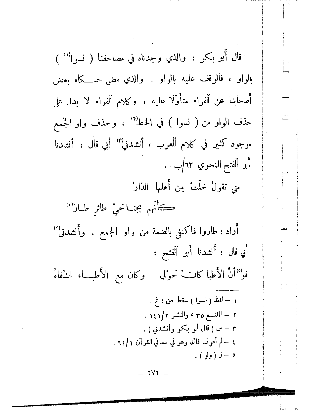 قال أبو بكر: والذي وجدناه في مصاحفنا (نسوا) بالواو، فالوقف عليه بالواو. والذي مضى حكاه بعض أصحابنا عن الفراء متأولاً عليه، وكلام الفراء لا يدل على حذف الواو من (نسوا) في الخط، وحذف واو الجمع موجود كثير في كلام العرب، أنشدني أبي قال: أنشدنا أبو الفتح النحوي