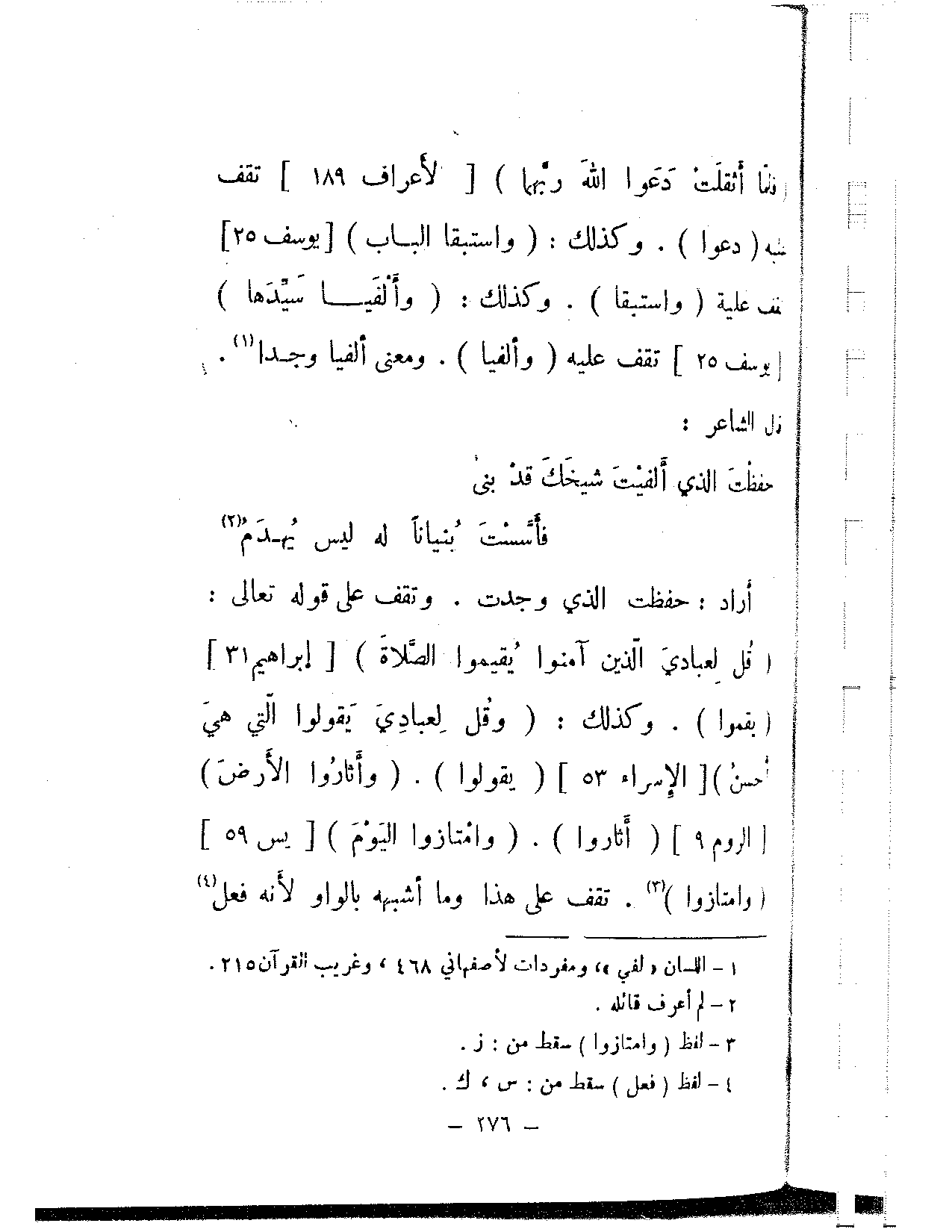 أراد: حفظت الذي وجدت. وتقف على قوله تعالى: {قل لعبادي الذين آمنوا يقيموا الصلاة} [إبراهيم: 31] (يقموا). وكذلك: {وقل لعبادي يقولوا التي هي أحسن} [الإسراء: 53] (يقولوا). {وأثاروا الأرض} [الروم: 9] (أثاروا). {وامتازوا اليوم} [يس: 59] (وامتازوا). تقف على هذا وما أشبهه بالواو لأنه فعل