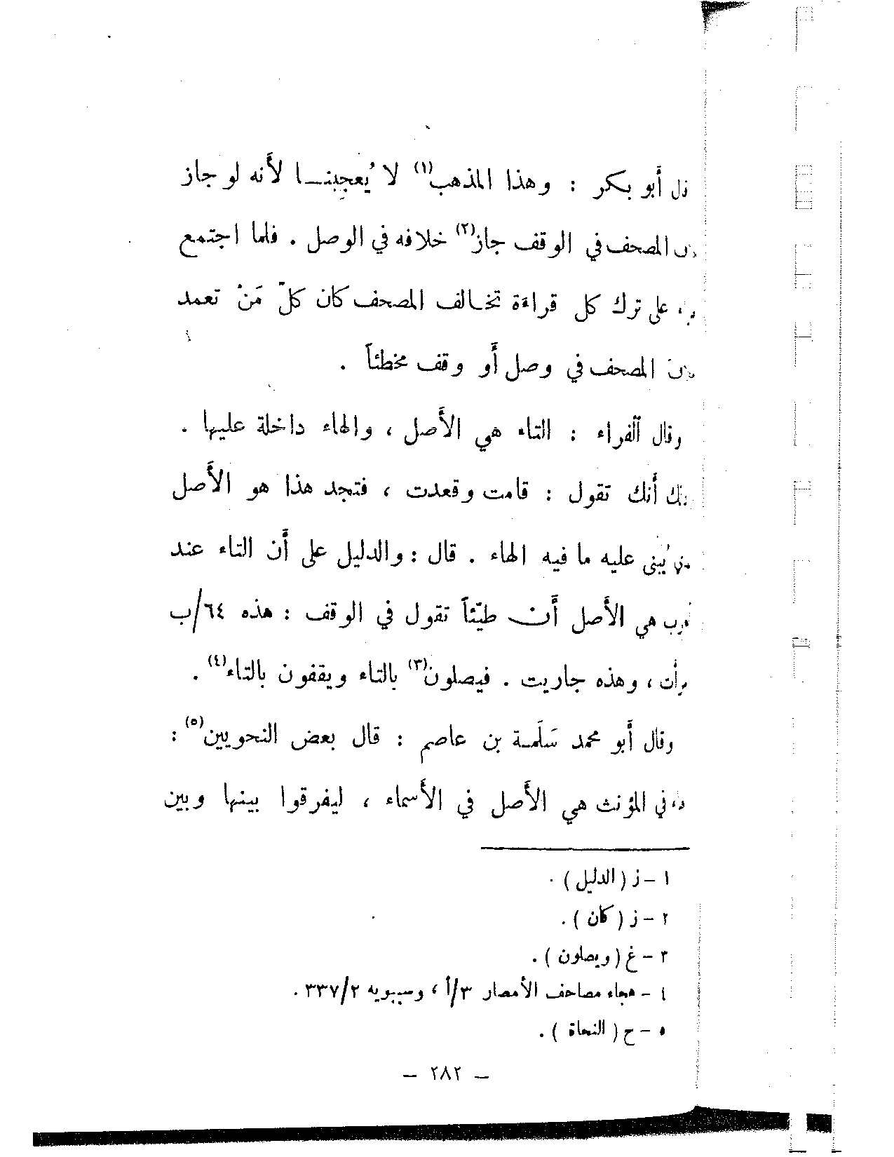 قال أبو بكر: وهذا المذهب لا يعجبنا لأنه لو جاز في المصحف في الوقف جاز خلافه في الوصل. فلما اجتمع الفراء على ترك كل قراءة تخالف المصحف كان كل من تعمد في المصحف في وصل أو وقف مخطئًا.