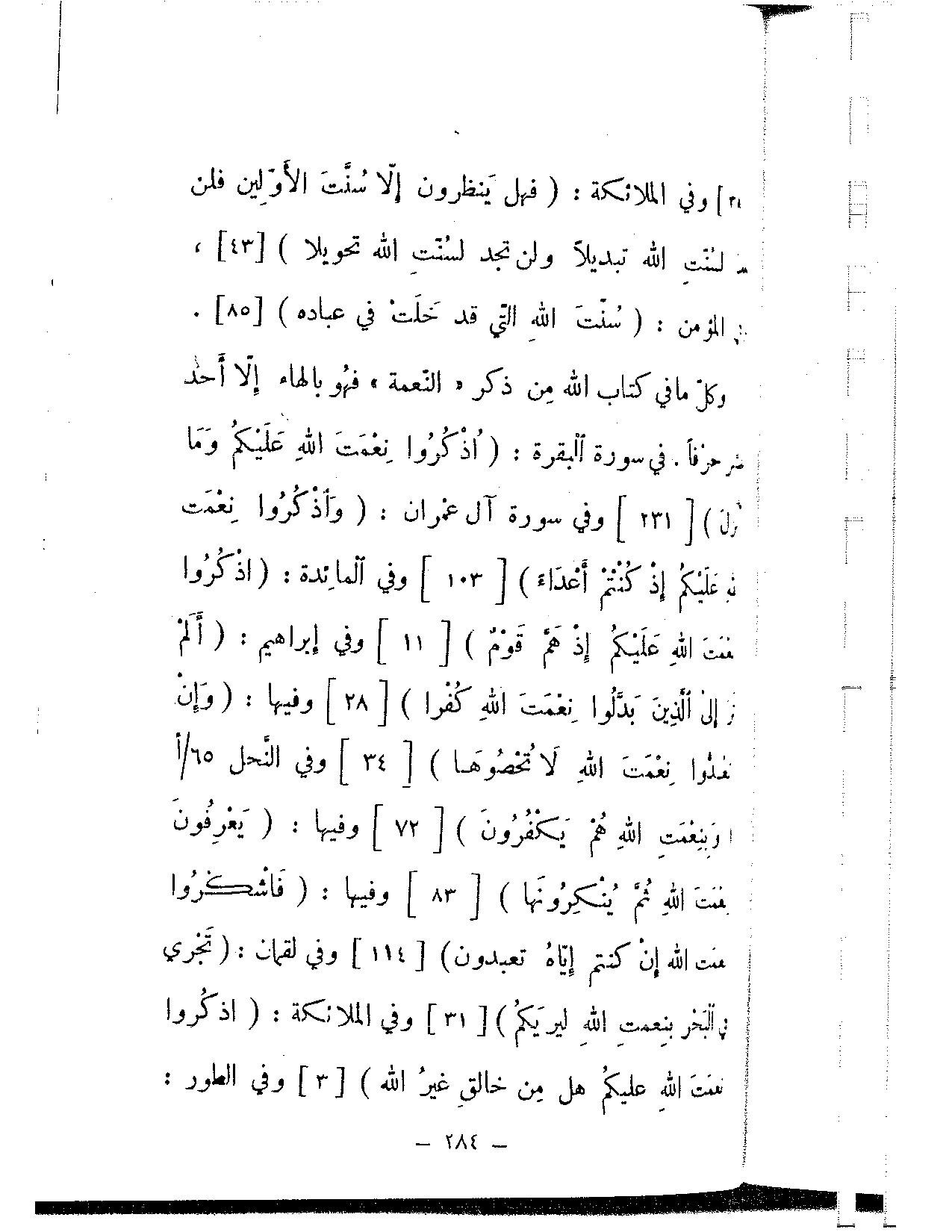 [34] وفي الملائكة: {فهل ينظرون إلا سنت الأولين فلن لسنت الله تبديلا ولن تجد لسنت الله تحويلا} [43]، وفي المؤمن: {سنت الله التي قد خلت في عباده} [85].