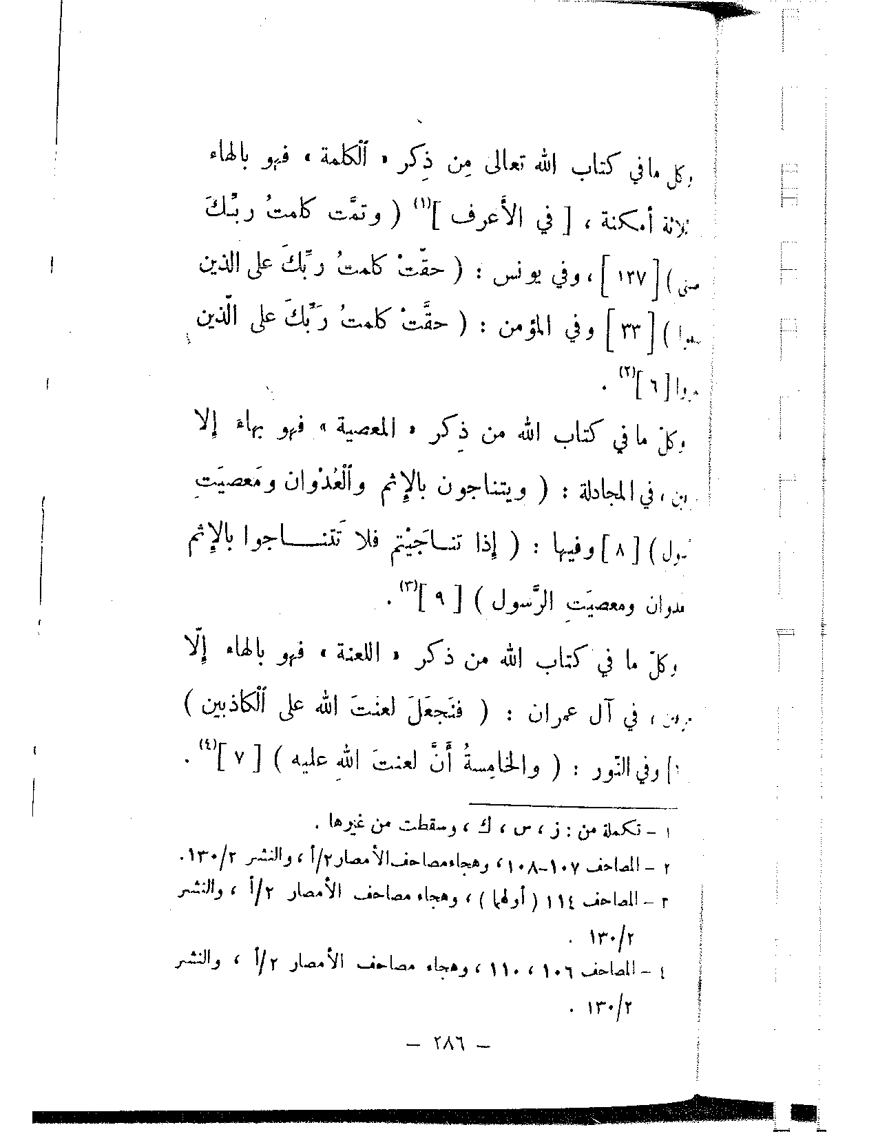 وكل ما في كتاب الله تعالى من ذكر «الكلمة» فهو بالهاء ثلاثة أمكنة، [في الأعراف] {وتمت كلمة ربك مني} [137]، وفي يونس: {حقت كلمت ربك على الذين فسقوا} [33] وفي المؤمن: {حقت كلمت ربك على الذين كفروا} [6]