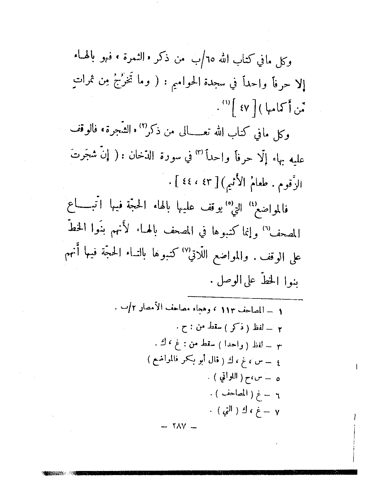 وكل ما في كتاب الله تعالى من ذكر «الشجرة» فالوقف عليه بهاء إلا حرفًا واحدًا في سورة الدخان: {إن شجرت الزقوم. طعام الأثيم} [43، 44].