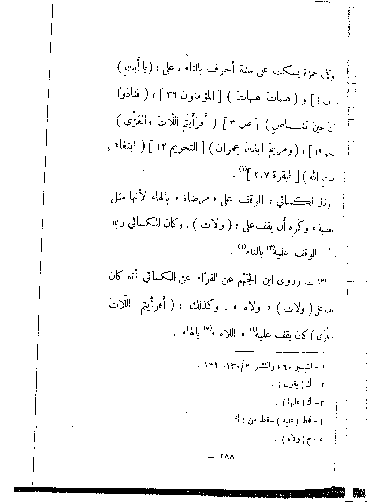 139 - وروى ابن الجهم عن الفراء عن الكسائي أنه كان يقف على (ولات) «ولاه». وكذلك: (أفرأيتم اللات والعزى) كان يقف عليه «اللاه» بالهاء.