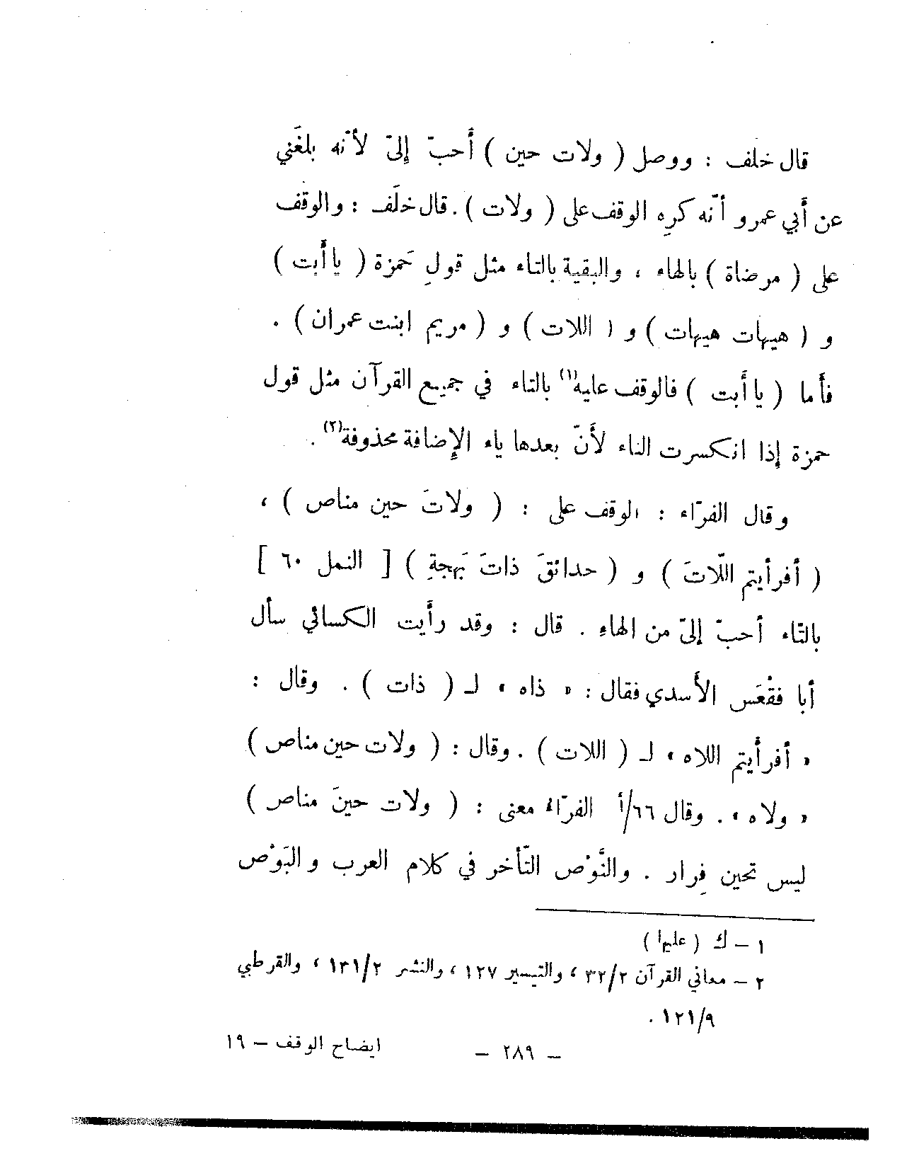 وقال الفراء: الوقف على: (ولات حين مناص)، (أفرأيتم اللات) و {حدائق ذات بهجة} [النمل: 60] بالتاء أحب إلي من الهاء. قال: وقد رأيت الكسائي سأل أبا فقعس الأسدي فقال: «ذاه» لـ (ذات). وقال: «أفرأيتم اللاه» لأـ (اللات). وقال: (ولات حين مناص) ليس تحين فرار. والنوص التأخر في كلام العرب والبوص