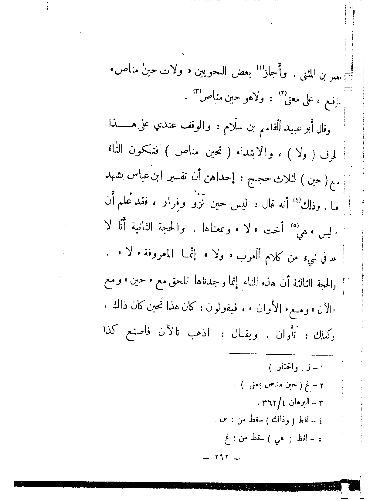 وقال أبو عبيد القاسم بن سلام: والوقف عندي على هذا الحرف (ولا)، والابتداء (تحين مناص) فتكون التاء مع (حين) لثلاث حجج: إحداهن أن تفسير ابن عباس يشهد. وذلك أنه قال: ليس حين نزو وفرار، فقد علم أن «ليس» هي أخت «لا» وبمعناها. والحجة الثانية أنا لا نجد في شيء من كلام العرب «ولا» إنما المعروفة «لا».