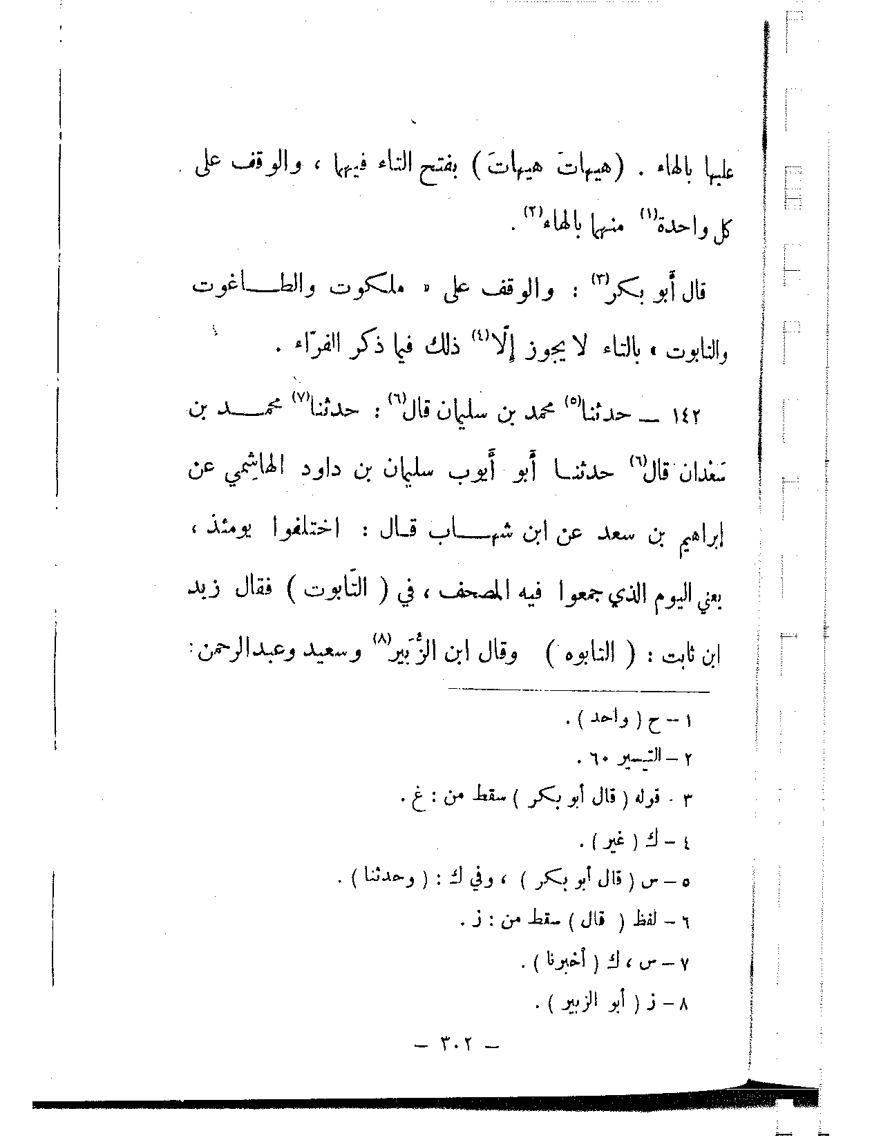 142 - حدثنا محمد بن سلميان قال: حدثنا محمد بن سعدان قال حدثنا أبو أيوب سليمان بن داود الهاشمي عن إبراهيم بن سعد عن ابن شهاب قال: اختلفوا يومئذ، يعني اليوم الذي جمعوا فيه المصحف، في (التابوت) فقال زيد بن ثابت: (التابوه) وقال ابن الزبير وسعيد وعبد الرحمن