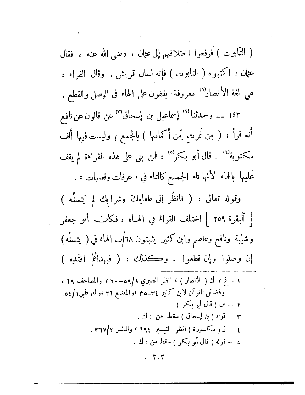 143 - وحدثنا إسماعيل بن إسحاق عن قالون عن نافع أنه قرأ: (من ثمرت من أكمالها) بالجمع؛ وليست فيها ألف مكتوبة. قال أبو بكر: فمن بنى على هذه القراءة لم يقف عليها بالهاء لأنها تاء الجمع كالتاء في «عرفات وقصبات».