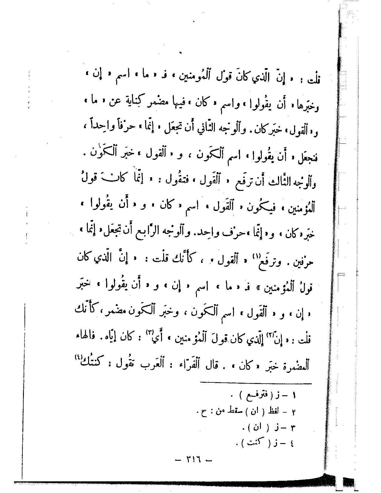 قلت: «إن الذي كان قول المؤمنين» فـ «ما» اسم «إن» وخبرها «أن يقولوا» واسم «كان» فيها مضمر كناية عن «ما» و «القول» خبر كان. والوجه الثاني أن تجعل «إنما» حرفًا واحدًا، فتجعل «أن يقولوا» اسم الكون، و «القول» خبر الكون. والوجه الثالث أن ترفع «القول» فتقول: «إنما كان قول المؤمنين» فيكون «القول» اسم «كان» و «أن يقولوا» خبر «كان» و «إنما» حرف واحد. والوجه الرابع أن تجعل «إنما» حرفين. وترفع «القول»، كأنك قلت: «إن الذي كان قول المؤمنين» فـ «ما» اسم «إن» و «أن يقولوا» خبر «إن» و «القول» اسم الكون، وخبر الكون مضمر، كأنك قلت: «إن الذي كان قول المؤمنين» أي: كان إياه. فالهاء المضمرة خبر «كان». قال الفراء: العرب تقول: كنتك