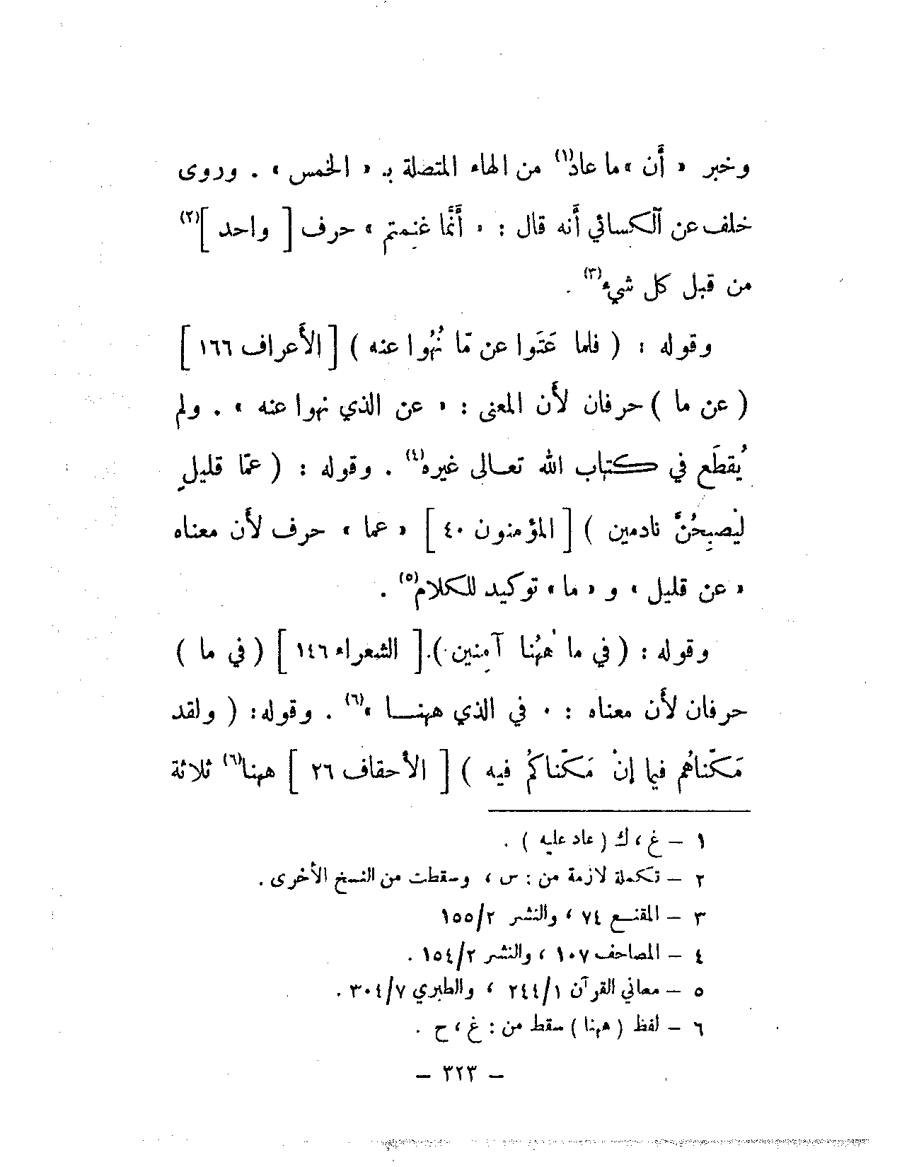 وقوله: {في ما ههنا آمنين} [الشعراء: 146] (في ما) حرفان لأن معناه: «في الذي ههنا». وقوله: {ولقد مكناهم فيما إن مكناكم فيه} [الأحقاف: 26] ههنا ثلاثة