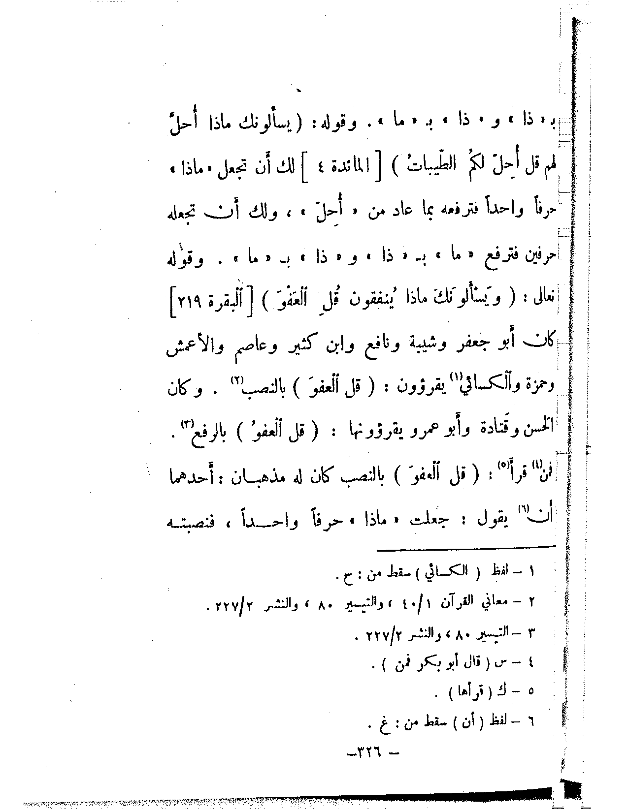 بـ «ذا» و «ذا» بـ «ما». وقوله: {يسألونك ماذا أحل لهم قال أحل لكم الطيبات} [المائدة: 4] لك أن تجعل ماذا حرفًا واحدًا فترفعه بما عاد من «أحل»، ولك أن تجعله حرفين فترفع «ما» بـ «ذا» و «ذا» بـ «ما». وقوله تعالى: {ويسألونك ماذا ينفقون قل العفو} [البقرة: 219] كان أبو جعفر وشيبة ونافع وابن كثير وعاصم والأعمش وحمزة والكسائي يقرؤون: (قل العفو) بالنصب. وكان الحسن وقتادة وأبو عمرو يقرؤونها: (قل العفو) بالرفع.