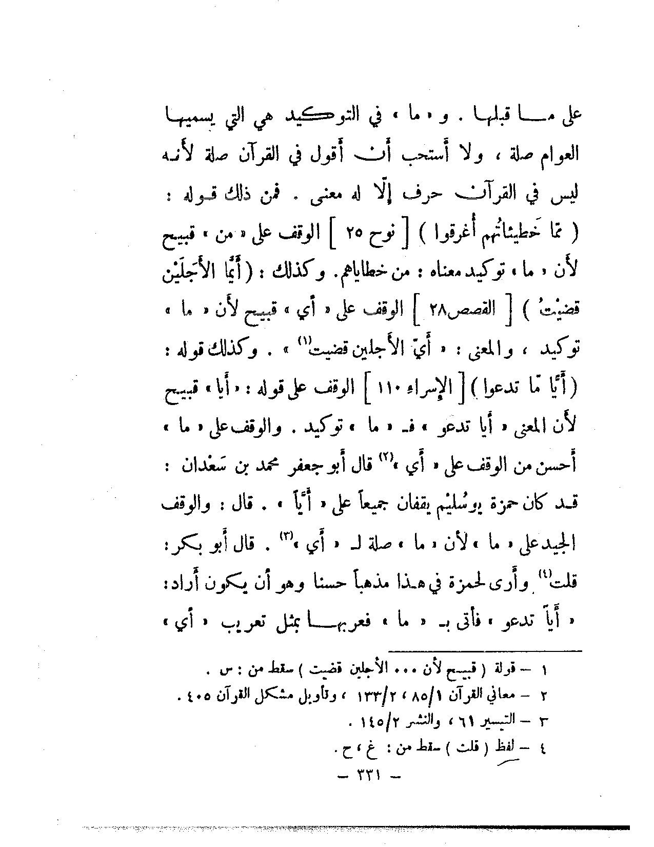 على ما قبلها. و «ما» في التوكيد هي التي يسميها العوام صلة، ولا أستحب أن أقول في القرآن صلة لأنه ليس في القرآن حرف إلا له معنى. فمن ذلك قوله: {مما خطيئاتهم أغرقوا} [نوح: 25] الوقف على «من» قبيح لأن «ما» توكيد معناه: من خطاياهم. وكذلك: {أيما الأجلين قضيت} [القصص: 28] الوقف على أي قبيح لأن ما توكيد، والمعنى: «أي الأجلين قضيت». وكذلك قوله: {أيا ما تدعوا} [الإسراء: 110] الوقف على قوله: «أيا» قبيح لأن المعنى «أيا تدعو» فـ «ما» توكيد. والوقف على «ما» أحسن من الوقف على «أي» قال أبو جعفر محمد بن سعدان: قد كان حمزة يوسليم يقفان جميعًا على «أيا». قال: والوقف الجيد على ما لأن ما صلة لـ «أي». قال أبو بكر: قلت وأرى لحمزة في هذا مذهبًا حسنا وهو أن يكون أراد: «أيا تدعو» فأتى بـ «ما» فعربها بمثل تعريف «أي»