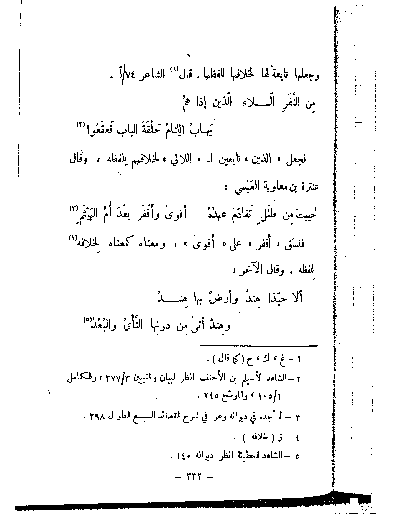 فجعل «الذين» تابعين لـ «اللائي» لخلافهم للفظه، وقال عنترة بن معاوية العبسي: