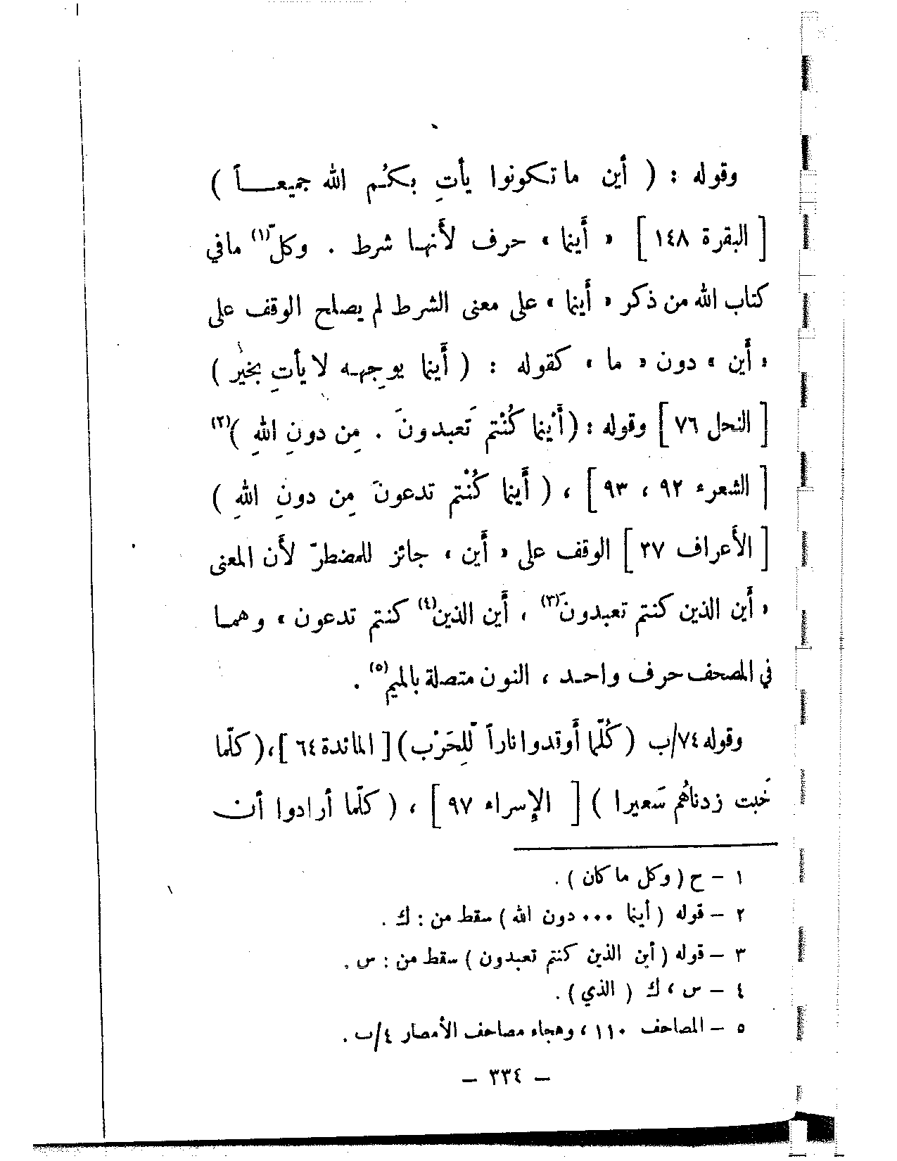 وقوله: {أين ما تكونوا يأت بكم الله جميعًا} [البقرة: 148] «أينما» حرف لأنها شرط. وكل ما في كتاب الله من ذكر «أينما» على معنى الشرط لم يصلح الوقف على «أين» دون «ما» كقوله: {أينما يوجهه لا يأت بخير} [النحل: 76] وقوله: {أينما كنتم تعبدون. من دون الله} الشعراء: 92، 93]، {أينما كنتم تدعون من دون الله} [الأعراف: 37] الوقف على «أين» جائز للمضطر لأن المعنى «أين الذين كنتم تعبدون» أين الذين كنتم تدعون وهما في المصحف حرف واحد، النون متصلة بالميم.