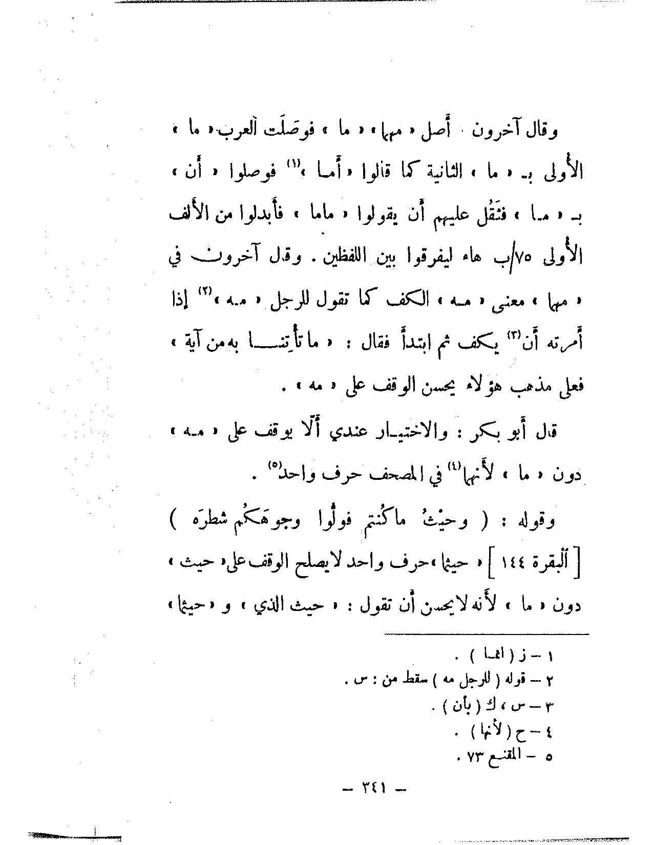 قال أبو بكر: والاختيار عندي ألا يوقف على «مه» دون «ما» لأنهما في المصحف حرف واحد.