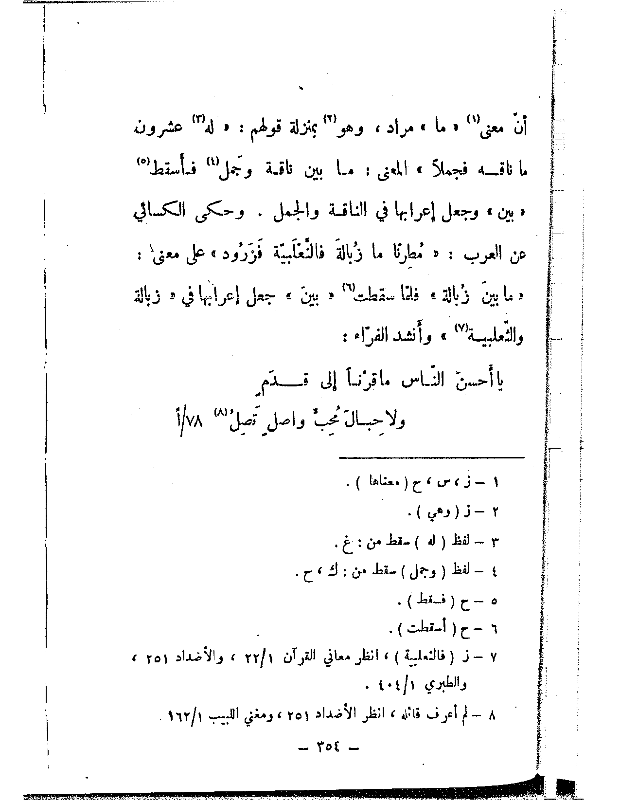 أن معنى «ما» مراد، وهو بمنزلة قولهم: «له عشرون ما ناقة فجملا» المعنى: ما بين ناقة وجمل فأسقط «بين» وجعل إعرابها في الناقة والجمل. وحكى الكسائي عن العرب: «مطرنا ما زبالة فالنعلبية فزرود» على معنى: «ما بين زبالة» فلما سقطت «بين» جعل إعرابها في «زبالة والثعلبية» وأنشد الفراء: