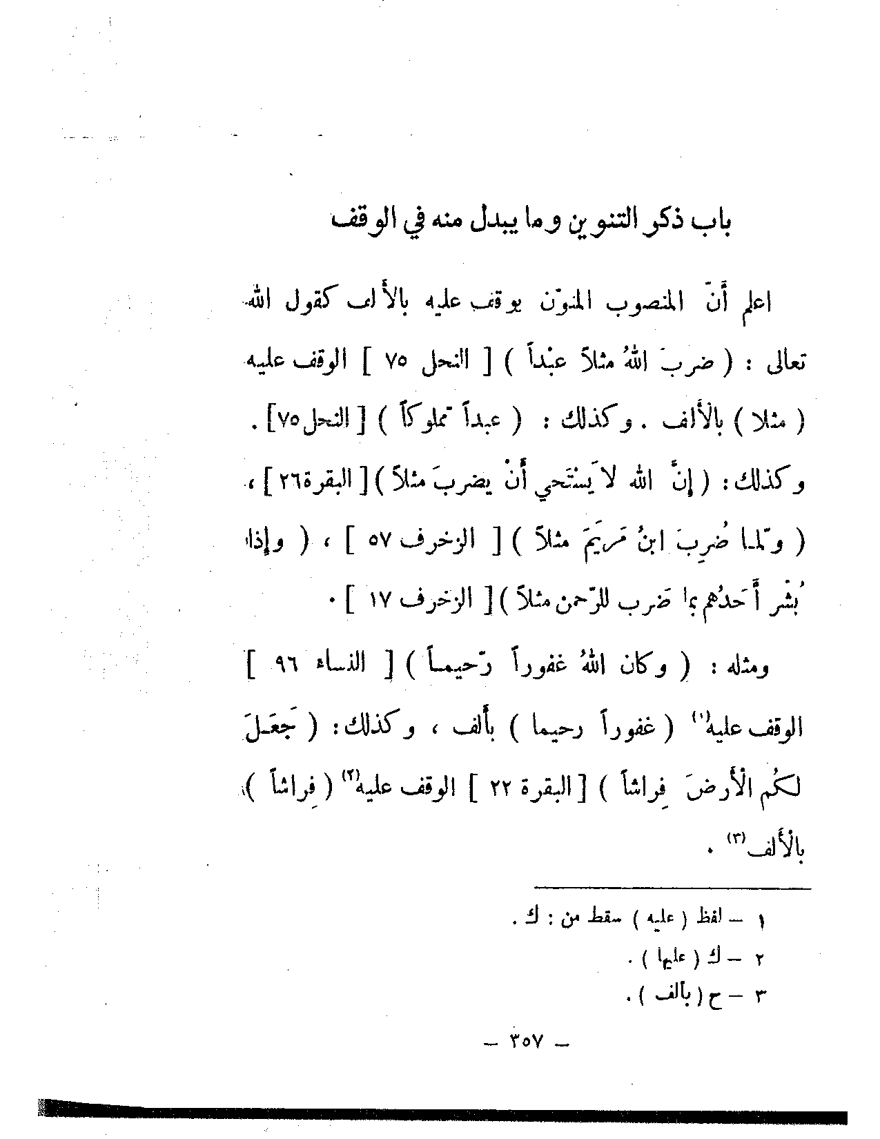 اعلم أن المنصوب المنون يوقف عليه بالألف كقول الله تعالى: {ضرب الله مثلا عبدا} [النحل: 75] الوقف عليه (مثلاً) بالألف. وكذلك: {عبدا مملوكا} [النحل: 75]. وكذلك: {إن الله لا يستحي أن يضرب مثلا} [البقرة: 26]، {ولما ضرب ابن مريم مثلا} [الزخرف: 57]، {وإذا بشر أحدهم بما ضرب للرحمن مثلا} [الزخرف: 17].