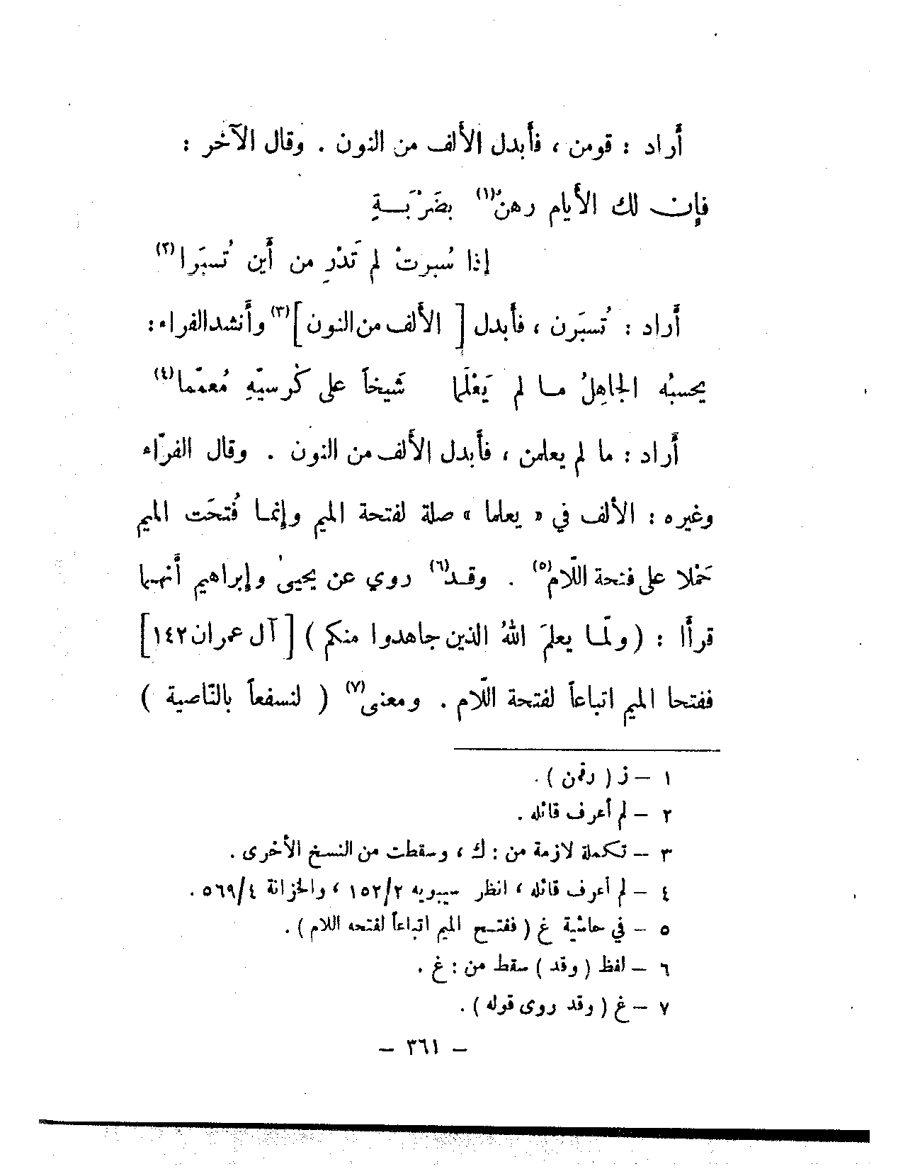 أراد: تسبرن، فأبدل [الألف من النون] وأنشد الفراء: