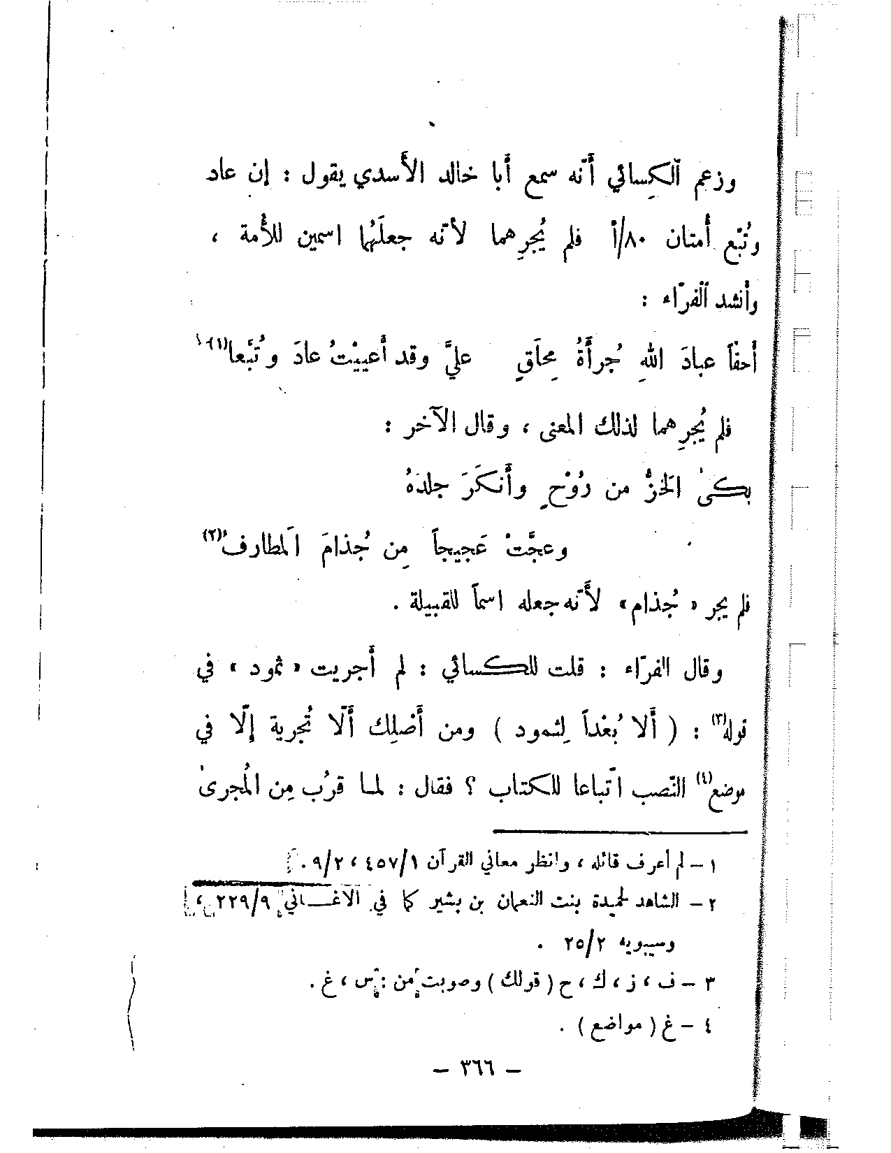 وقال الفراء: قلت للكسائي: لم أجريت «ثمود» في قوله: (ألا بعدا لثمود) ومن أصلك ألا تجرية إلا في موضع النصب اتباعًا للكتاب؟ فقال: لما قرب من المجرى