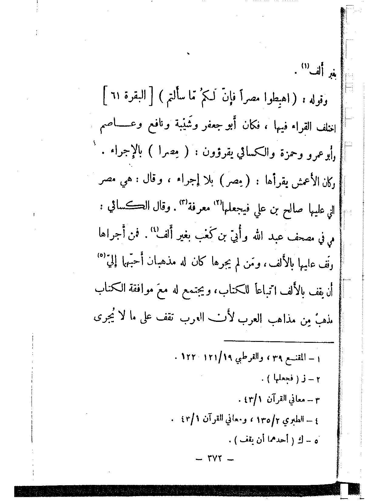 وقوله: {اهبطوا مصرا فإن لكم ما سألتم} [البقرة: 61] اختلف القراء فيها، فكان أبو جعفر وشيبة ونافع وعاصم وأبو عمرو وحمزة والكسائي يقرؤون: (مصرا) بالإجراء. وكان الأعمش يقرأها: (مصر) بلا إجراء، وقال: هي مصر التي عليها صالح بن علي فيجعلها معرفة. وقال الكسائي: هي في مصحف عبد الله وأبي بن كعب بغير ألف. فمن أجراها وقف عليها بالألف، ومن لم يجرها كان له مذهبان أحبهما إلي أن يقف بالألف اتباعًا للكتاب، ويجتمع له مع موافقة الكتاب مذهب من مذاهب العرب لأن العرب تقف على ما لا يجرى