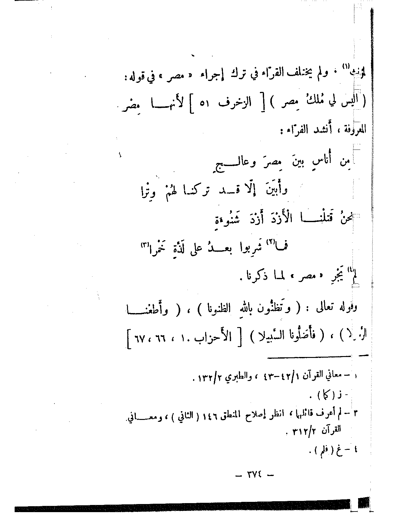لمؤنث. ولم يختلف القراء في ترك إجراء «مصر» في قوله: {اليس لي ملك مصر} [الزخرف: 51] لأنها مصر المعروفة، أنشد الفراء: