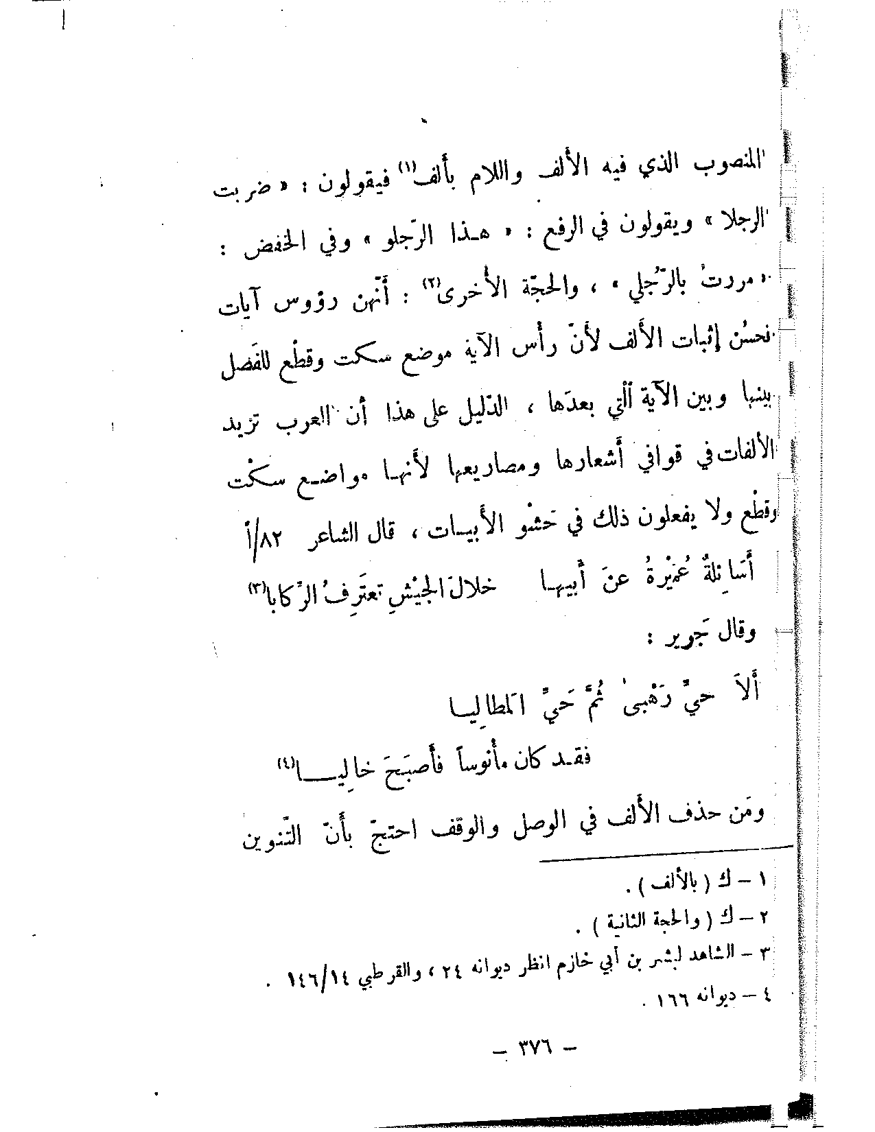 المنصوب الذي فيه الألف واللام بألف فيقولون: «ضربت الرجلا» ويقولون في الرفع: «هذا الرجلو» وفي الخفض: «مررت بالرجلي» والحجة الأخرى: أنهن رؤوس آيات فحسن إثبات الألف لأن رأس الآية موضع سكت وقطع للفصل بينها وبين الآية التي بعدها، الدليل على هذا أن العرب تزيد الألفات في قوافي أشعارها ومصاريعها لأنها مواضع سكت وقطع ولا يفعلون ذلك في حشو الأبيات، قال الشاعر: