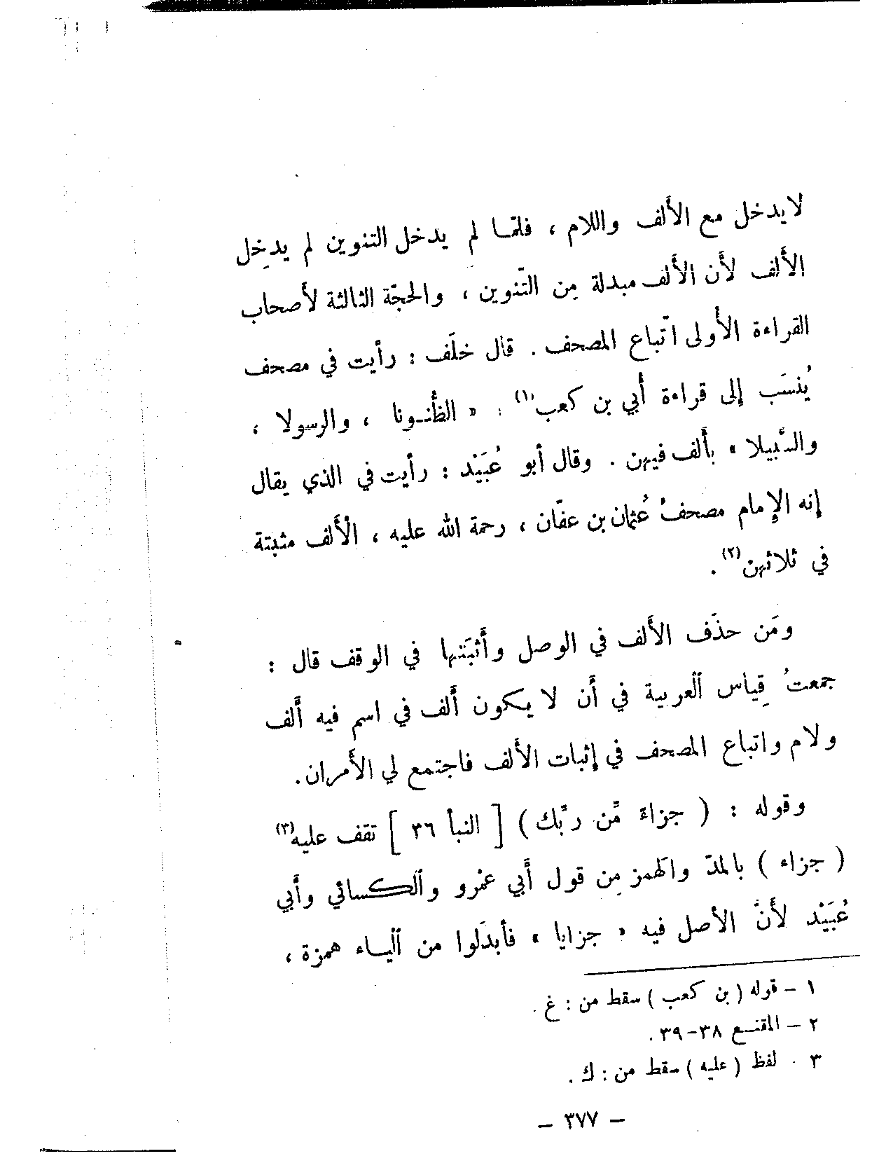 لا يدخل مع الألف واللام، فلما لم يدخل التنوين لم يدخل الألف لأن الألف مبدلة من التنوين، والحجة الثالثة لأصحاب القراءة الأولى اتباع المصحف. قال خلف: رأيت في مصحف ينسب إلى قراءة أبي بن كعب: «الظنونا، والرسولا، والسبيلا» بألف فيهن. وقال أبو عبيد: رأيت في الذي يقال إنه الإمام مصحف عثمان بن عفان، رحمة الله عليه، الألف مثبتة في ثلاثهن.