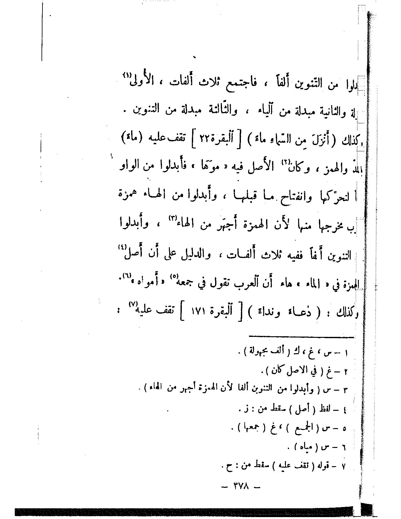 بدلوا من التنوين ألفا، فاجتمع ثلاث ألفات، الأولى والثانية مبدلة من الياء، والثالثة مبدلة من التنوين. وكذلك {أنزل من السماء ماء} [البقرة: 22] تقف عليه (ماء) بالمد والهمز، وكان الأصل فيه «موها» فأبدلوا من الواو لتحركها وانفتاح ما قبلها، وأبدلوا من الهاء همزة مخرجها منها لأن الهمزة أجهر من الهاء، وأبدلوا التنوين ألفًا ففيه ثلاث ألفات، والدليل على أن أصل الهمزة في «الماء» هاء أن العرب تقول في جمعه «أمواه». وووكذلك: {دعاء ونداء} [البقرة: 171] تقف عليه: