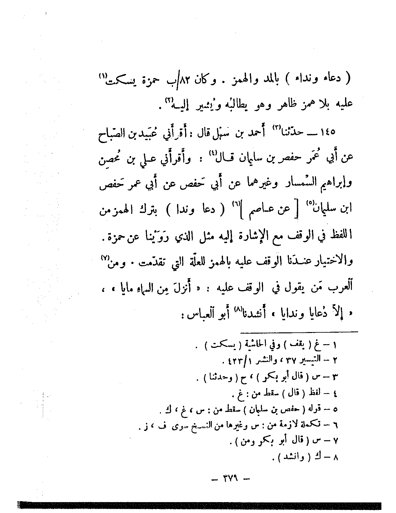 145 - حدثنا أحمد بن سهل قال: أقرأني عبيد بن الصباح عن أبي عمر حفص ابن سليمان قال: وأقرأني علي بن محصن وإبراهيم السمسار وغيرهما عن أبي حفص عن أبي عمر حفص بن سليمان [عن عاصم] (دعا وندا) بترك الهمز من اللفظ في الوقف مع الإشارة إليه مثل الذي روينا عن حمزة. والاختيار عندنا الوقف عليه بالهمز للعلة التي تقدمت. ومن العرب من يقول في الوقف عليه: «أنزل من السماء مايا»، «إلا دعايا وندايا» أنشدنا أبو العباس: