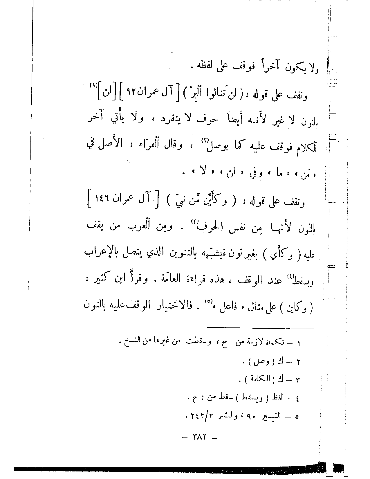 وتقف على قوله: {لن تنالوا البر} [آل عمران: 92] [لن] بالنون لا غير لأنه أيضًا حرف لا ينفرد، ولا يأتي آخر الكلام فوقف عليه كما يوصل، وقال الفراء: الأصل في «من» «ما» وفي «لن» «لا».