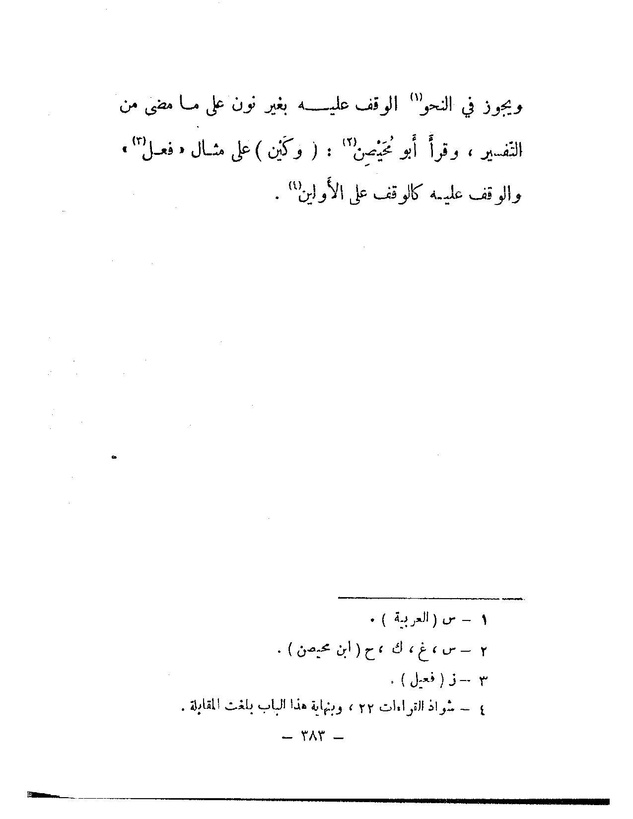 ويجوز في النحو الوقف عليه بغير نون على ما مضى من التفسير، وقرأ أبو محيصن: (وكين) على مثال «فعل» والوقف عليه كالوقف على الأولين.