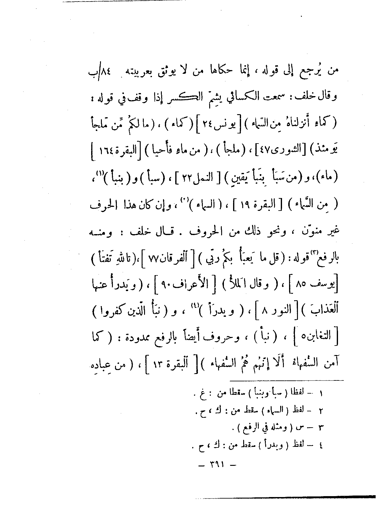 من يرجع إلى قوله، إنما حكاها من لا يوثق بعربيته. وقال خلف: سمعت الكسائي يشم الكسر إذا وقف في قوله: {كماء أنزلناه من السماء} [يونس: 24] (كماء)، {ما لكم من ملجأ يومئذ} [الشورى: 47]، (ملجأ)، {من ماء فأحيا} [البقرة: 164] (ماء)، و {من سبأ بنبأ يقين} [النمل: 22]، (سبأ) و (بنبأ)، {من السماء} [البقرة: 19]، (السماء)، وإن كان هذا الحرف غير منون، ونحو ذلك من الحروف. قال خلف: ومنه بالرفع قوله: {قل ما يعبأ بكم ربي} [الفرقان: 77]، {تالله تفتأ} [يوسف: 85]، {وقال الملأ} [الأعراف: 90]، {ويدرأ عنها العذاب} [النور: 8]، (ويدرأ)، و {نبأ الذين كفروا} [التغابن: 5]، (نبأ)، وحروف أيضًا بالرفع ممدودة: {كما آمن السفهاء ألا إنهم هم السفهاء} [البقرة: 13]، {من عباده