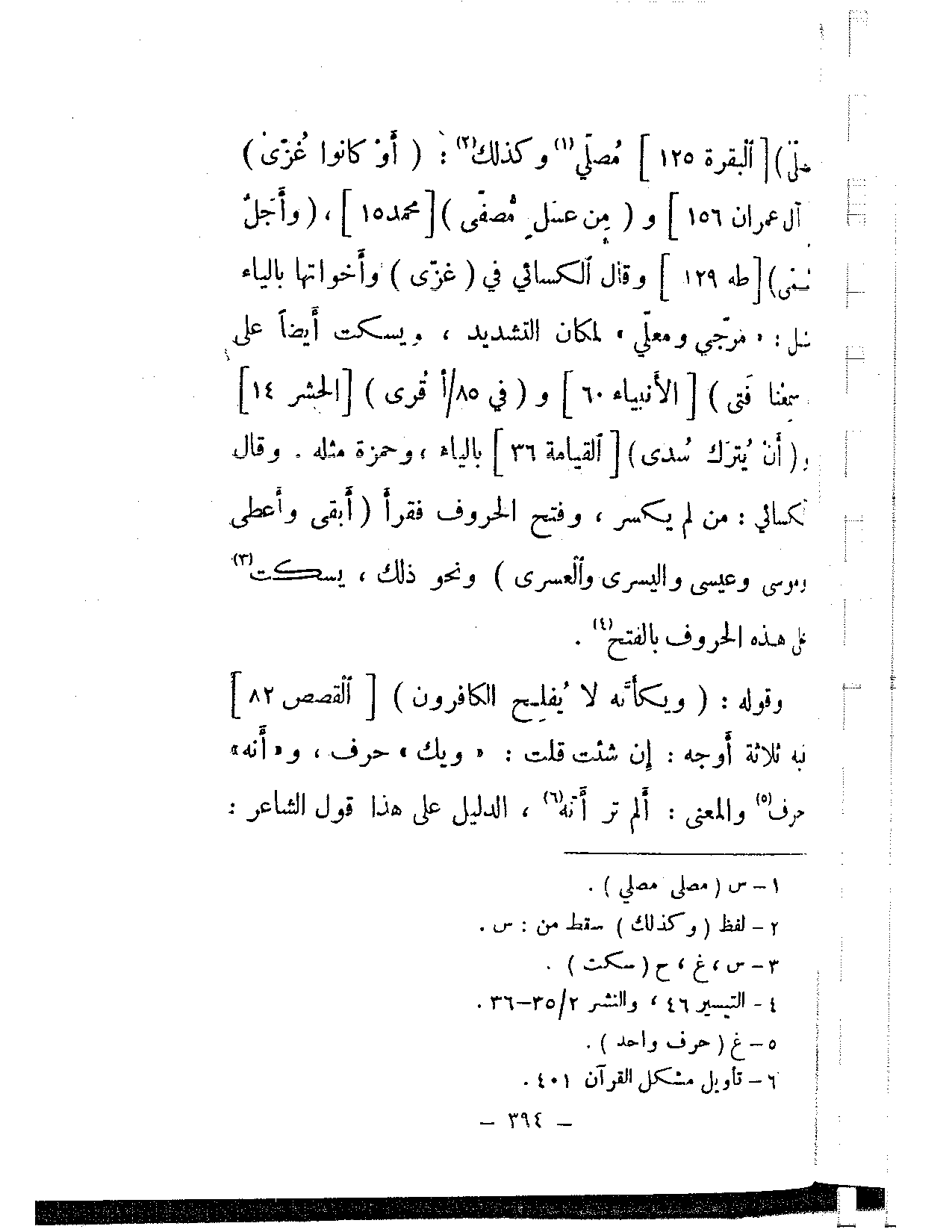 مصلى} [البقرة: 125] مصلي وكذلك: {أو كانوا غزى} [آل عمران: 156] و {من عسل مصفى} [محمد: 15]، {وأجل مسمى} [طه: 129] وقال الكسائي في (غزى) وأخواتها بالياء سئل: «مرجي ومعلي» لمكان التشديد، ويسكت أيضًا على {سمعنا فتى} [الأنبياء: 60] و {في قرى} [الحشر: 14] و {أن يترك سدى} [القيامة: 36] بالياء، وحمزة مثله. وقال الكسائي: من لم يكسر، وفتح الحروف فقرأ (أبقى وأعطى وموسى وعيسى واليسرى والعسرى) ونحو ذلك، يسكت على هذه الحروف بالفتح.