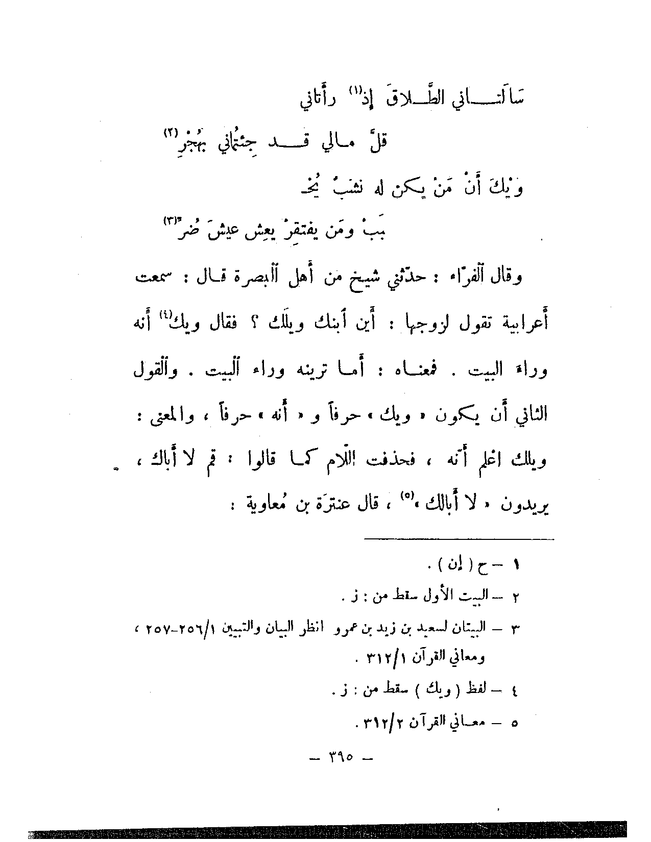 وقال الفراء: حدثني شيخ من أهل البصرة قال: سمعت أعرابية تقول لزوجها: أين ابنك ويلك؟ فقال ويك أنه وراء البيت. فمعناه: أما ترينه وراء البيت. والقول الثاني أن يكون «ويك» حرفًا و «أنه» حرفًا، والمعنى: ويلك اعلم أنه، فحذفت اللام كما قالوا: قم لا أباك، يريدون «لا أبالك»، قال عنترة بن معاوية:
