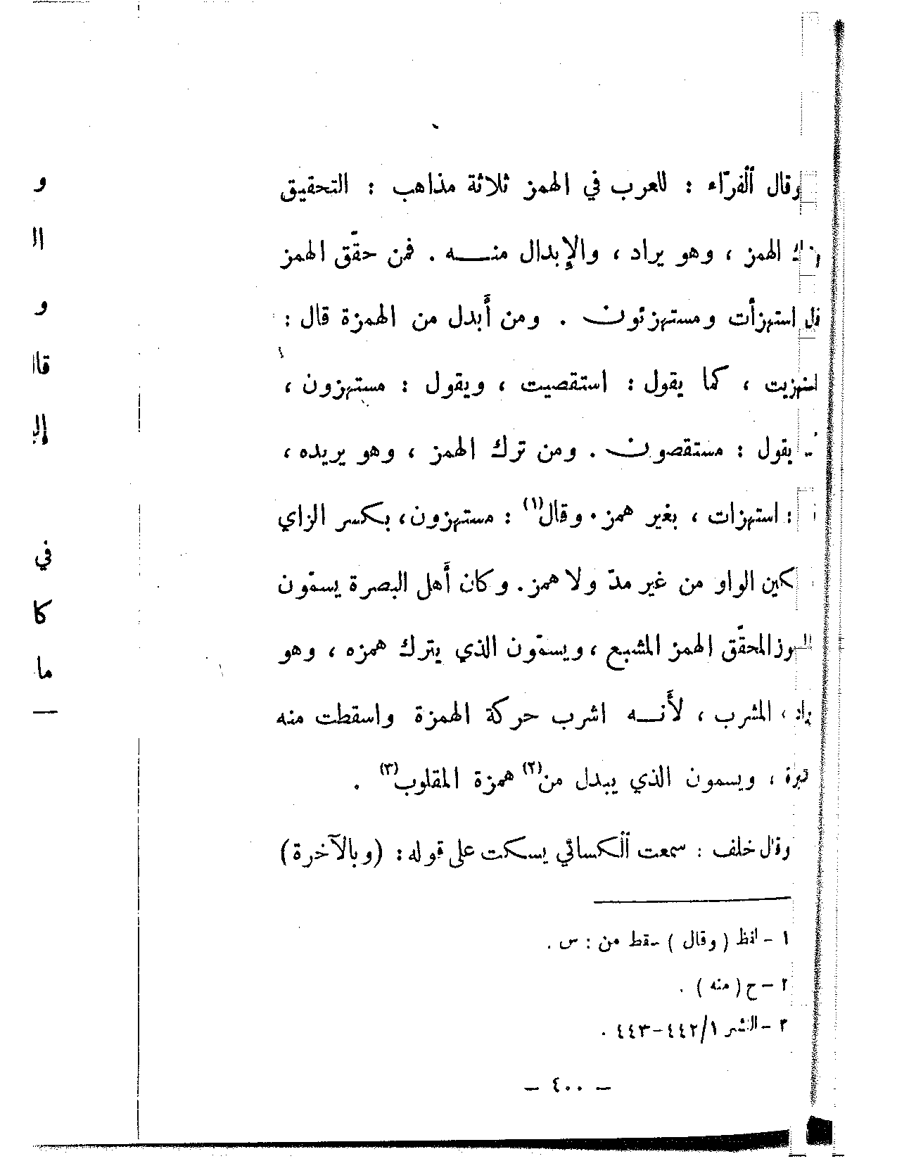 وقال الفراء: للعرب في الهمز ثلاثة مذاهب: التحقيق الهمز، وهو يراد، والإبدال منه. فمن حقق الهمز قال استهزأت ومستهزئون. ومن أبدل من الهمزة قال: استهزيت، كما يقول: استقصيت، ويقول: مستهزون، يقول: مستقصون. ومن ترك الهمز، وهو يريده، قال: استهزات، بغير همز. وقال: مستهزون، بكسر الزاي وتسكين الواو من غير مد ولا همز. وكان أهل البصرة يسمون الهمز المحقق الهمز المشبع، ويسمون الذي يترك همزه، وهو يراد، المشرب، لأنه اشرب حركة الهمزة واسقطت منه، ويسمون الذي يبدل من همزة المقلوب.