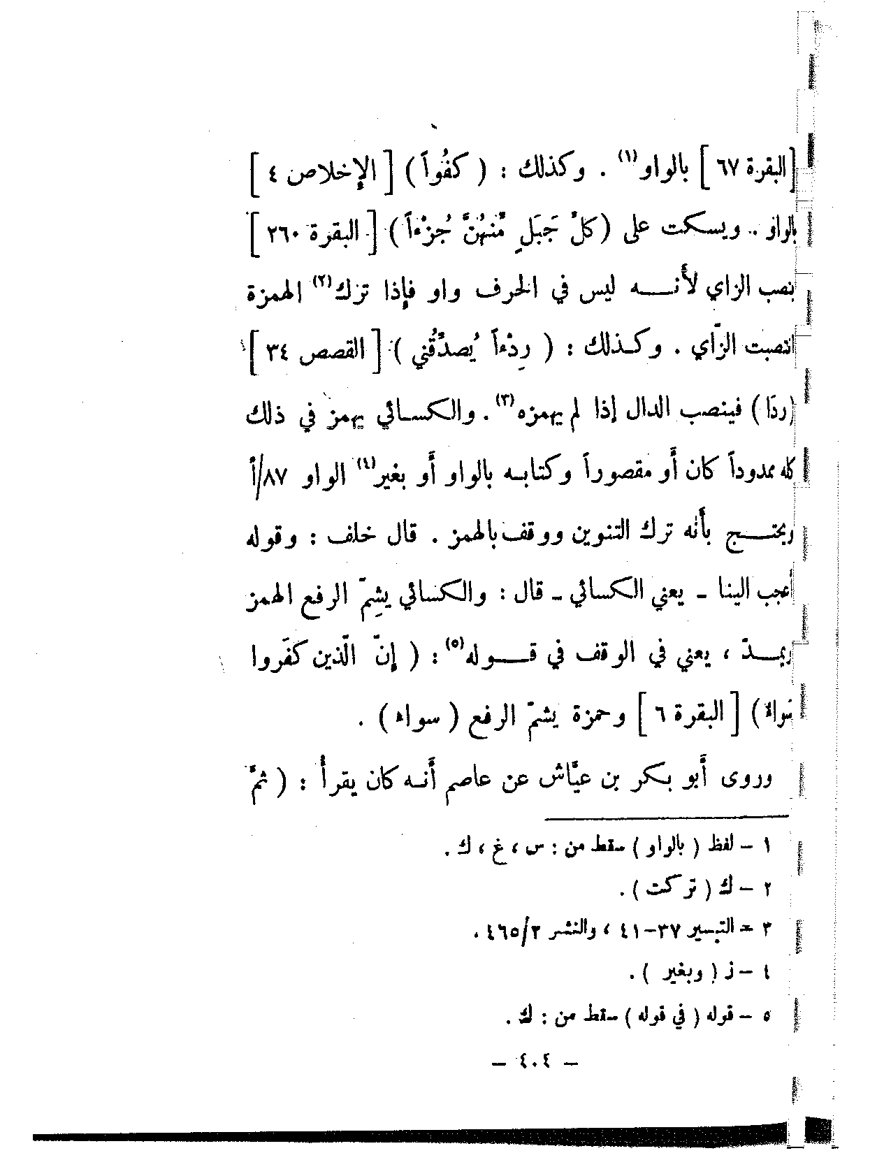 [البقرة: 67] بالواو. وكذلك: {كفوا} [الإخلاص: 4] بالواو. ويسكت على {كل جبار منهن جزءا} [البقرة: 260] بنصب الزاي لأنه ليس في الحرف واو فإذا ترك الهمزة انتصبت الزاي. وكذلك: {ردءا يصدقني} [القصص: 34] (ردا) فينصب الدال إذا لم يهمزه. والكسائي يهمز في ذلك كله ممدودًا كان أو مقصورًا وكتابه بالواو أو بغير الواو ويحتج بأنه ترك التنوين ووقف بالهمز. قال خلف: وقوله أعجب إلينا – يعني الكسائي – قال: والكسائي يشم الرفع الهمز ويمد، يعني في الوقف في قوله: {إن الذين كفروا سواء} [البقرة: 6] وحمزة يشم الرفع (سواء).