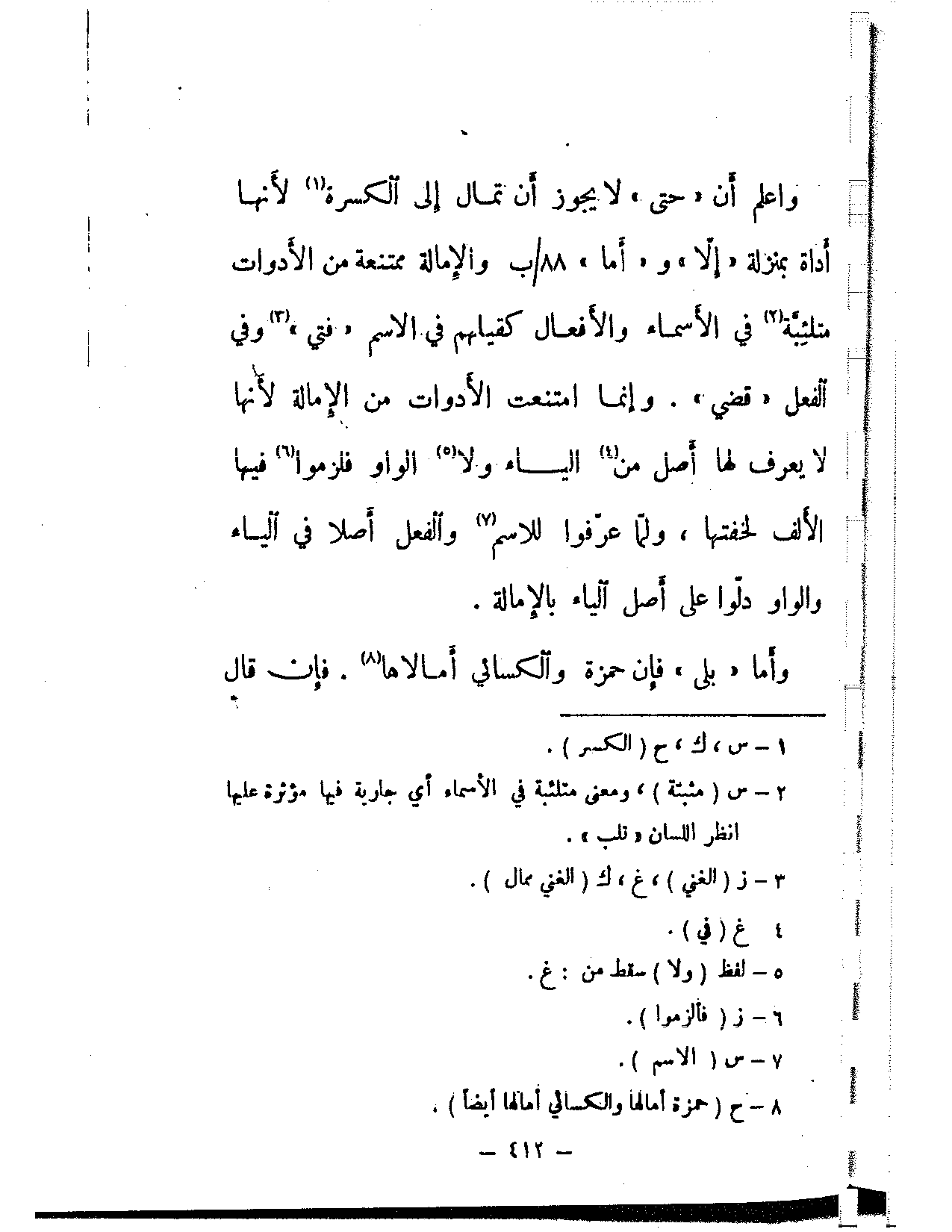 واعلم أن «حتى» لا يجوز أن تمال إلى الكسرة لأنها أداة بمنزلة «إلا» و «أما» والإمالة ممتنعة من الأدوات متلئبة في الأسماء والأفعال كقيامهم في الاسم «فتي» وفي الفعل «قضي». وإنما امتنعت الأدوات من الإمالة لأنها لا يعرف لها أصل من الياء ولا الواو فلزموا فيها الألف لخفتها، ولما عرفوا للاسم والفعل أصلا في الياء والواو دلوا على أصل الياء بالإمالة.