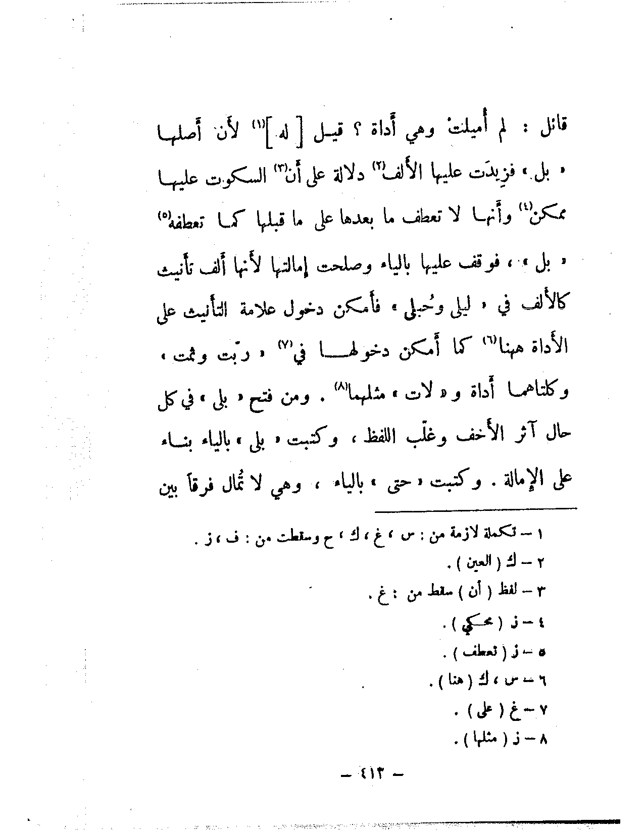 قائل: لم أميلت وهي أداة؟ قيل [له] لأن أصلها «بل» فزيدت عليها الألف دلالة على أن السكوت عليها ممكن وأنها لا تعطف ما بعدها على ما قبلها كما تعطفه «بل»، فوقف عليها بالياء وصلحت إمالتها لأنها ألف تأنيث كالألف في «ليلى وحُبلى» فأمكن دخول علامة التأنيث على الأداة ههنا كما أمكن دخولها في «ربت وثمت» وكلتاهما أداة و «لات» مثلهما. ومن فتح «بلى» في كل حال آثر الأخف وغلب اللفظ، وكتبت «بلى» بالياء بناء على الإمالة. وكتبت «حتى» بالياء، وهي لا تمال فرقًا بين