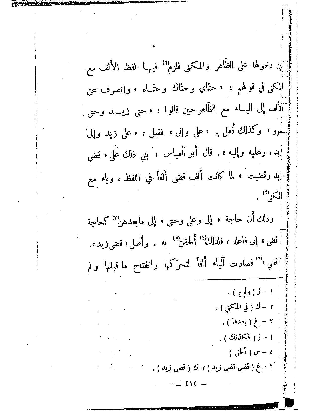 دخولها على الظاهر والمكني فلزم فيها لفظ الألف مع المكني في قولهم: «حتاي وحتاك وحتاه» وانصرف عن الألف إلى الياء مع الظاهر حين قالوا: «حتى زيد وحتى عمرو» وكذلك فعل بـ «على وإلى» فقيل: «على زيد وإلى زيد، وعليه وإليه». قال أبو العباس: بني ذلك على «قضي زيد وقضيت» لما كانت ألف قضى ألفًا في اللفظ، وياء مع المكني.