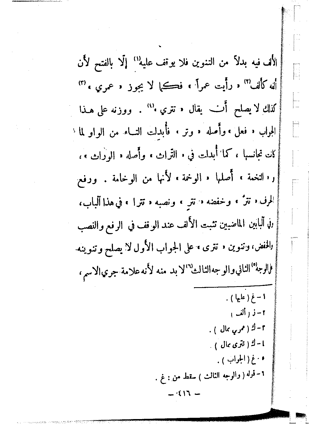 الألف فيه بدلاً من التنوين فلا يوقف عليه إلا بالفتح لأن ألفه كألف «رأيت عمرًا» فكما لا يجوز «عمري» كذلك لا يصلح أن يقال «تتري». ووزنه على هذا الجواب «فعل» وأصله «وتر» فأبدلت التاء من الواو لما كانت تجانسها، كما أبدلت في «التراث» وأصله «الوراث»، و «التخمة» أصلها «الوخمة» لأنها من الوخامة. ورفع الحرف «تتر» وخفضه «تتر» ونصبه «تترا» في هذا الباب، وفي البابين الماضيين تثبت الألف عند الوقف في الرفع والنصب والخفض، وتنوين «تترى» على الجواب الأول لا يصلح وتنوينه على الوجه الثاني والوجه الثالث لا بد منه لأنه علامة جري الاسم،