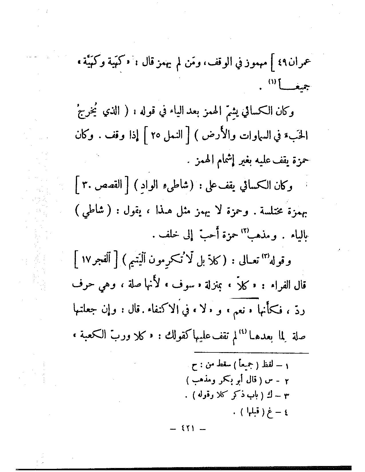 وقوله تعالى: {كلا بل لا تكرمون اليتيم} [الفجر: 17] قال الفراء: «كلا» بمنزلة «سوف» لأنها صلة، وهي حرف رد، فكأنها «نعم» و «لا» في الاكتفاء. قال: وإن جعلتها صلة لما بعدها لم تقف عليها كقولك: «كلا ورب الكعبة»