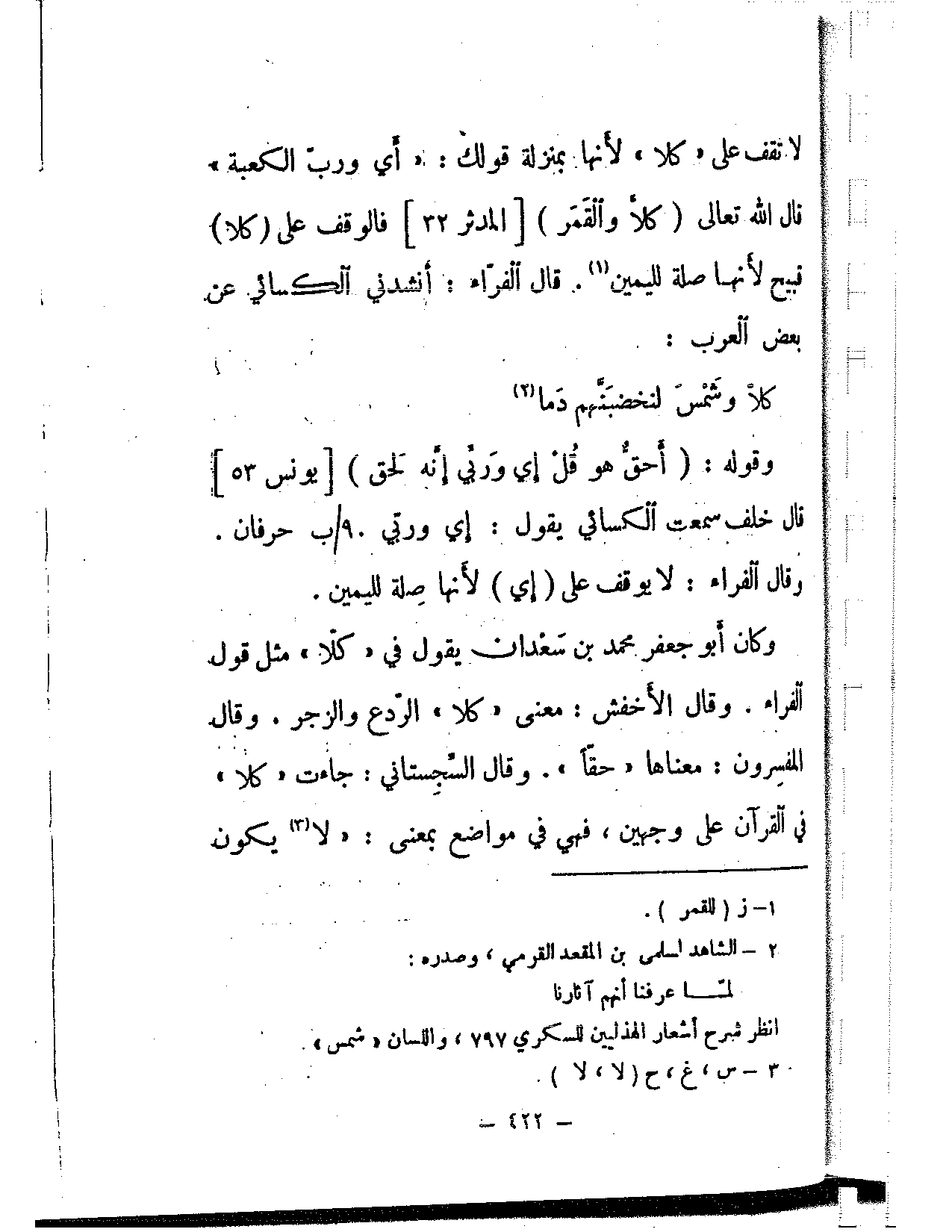 لا تقف على «كلا» لأنها بمنزلة قولك: «أي ورب الكعبة» قال الله تعالى {كلا والقمر} [المدثر: 32] فالوقف على (كلا) قبيح لأنها صلة لليمين. قال الفراء: أنشدني الكسائي عن بعض العرب: