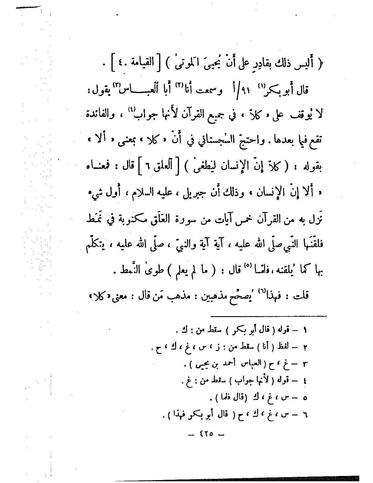 قال أبو بكر وسمعت أنا أبا العباس يقول: لا يوقف على «كلا» في جميع القرآن لأنها جواب، والفائدة تقع فيما بعدها. واحتج السجستاني في أن «كلا» بمعنى «ألا» بقوله: {كلا إن الإنسان ليطغى} [العلق: 6] قال: فمعناه «ألا إن الإنسان» وذلك أن جبريل عليه السلام، أول شيء نزل به من القرآن خمس آيات من سورة العلق مكتوبة في نمط فلقنها النبي صلى الله عليه وسلم، آية آية والنبي صلى الله عليه وسلم، يتكلم بها كما يُلقنه، فلما قال: (ما لم يعلم) طوى النمط.