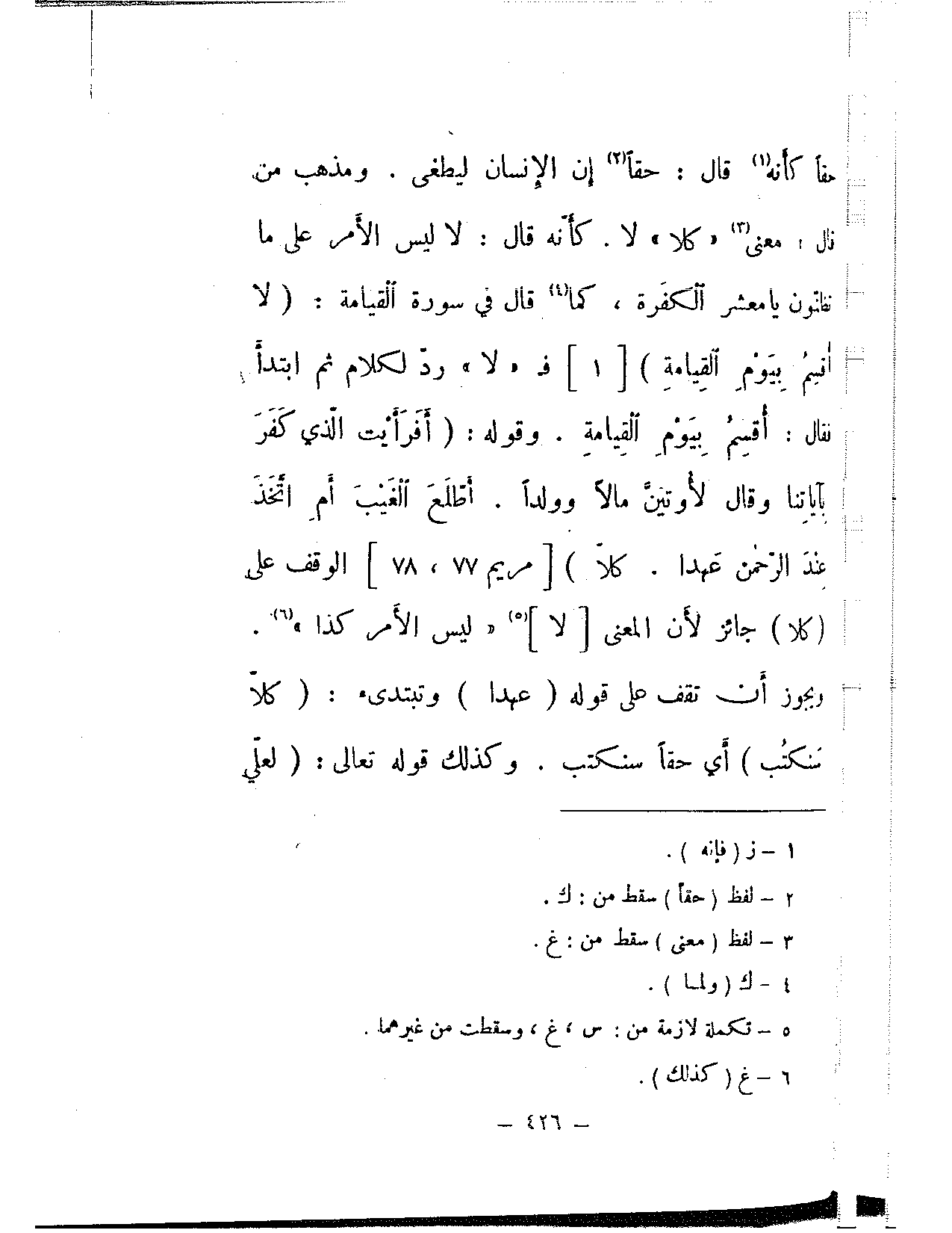 حقًا كأنه قال: حقًا إن الإنسان ليطغى. ومذهب من قال: معنى «كلا» لا. كأنه قال: لا ليس الأمر على ما تظنون يا معشر الكفرة، كما قال في سورة القيامة: {لا أقسم بيوم القيامة} [1] فـ «لا» رد لكلام ثم ابتدأ فقال: أقسم بيوم القيامة. وقوله: {أفرأيت الذي كفر بآياتنا وقال لأوتين مالا وولدا. أطلع الغيب أم اتخذ عند الرحمن عهدا. كلا} [مريم: 77، 78] الوقف على (كلا) جائز لأن المعنى [لا] «ليس الأمر كذا».