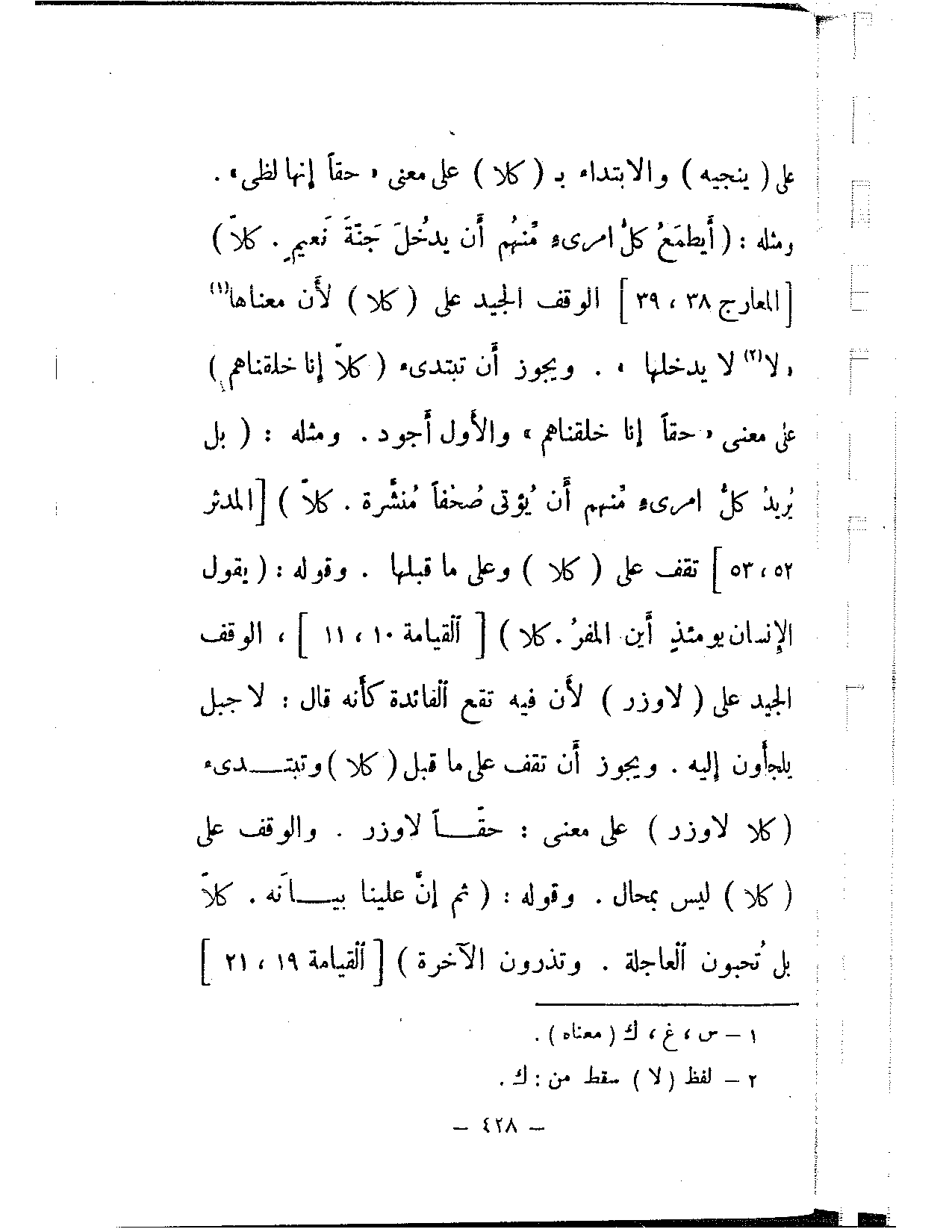 ومثله: {أيطمع كل امرئ منهم أن يدخل جنة نعيم. كلا} [المعارج: 38، 39] الوقف الجيد على (كلا) لأن معناها «لا لا يدلخها». ويجوز أن تبتدئ (كلا إنا خلقناهم) على معنى «حقًا إنا خلقناهم» والأول أجود. ومثله: {بل يريد كل امريء منهم أن يؤتى صحفا منشرة. كلا} [المدثر: 52، 53] تقف على (كلا) وعلى ما قبلها. وقوله: {يقول الإنسان يومئذ أين المفر. كلا} [القيامة: 10، 11]، الوقف الجيد على (لا وزر) لأن فيه تقع الفائدة كأنه قال: لا جبل يلجأون إليه. ويجوز أن تقف على ما قبل (كلا) وتبتدئ (كلا لا وزر) على معنى: حقًا لا وزر. والوقف على (كلا) ليس بمحال. وقوله: {ثم إن علينا بيانه. كلا بل تحبون العاجلة. وتذرون الآخرة} [القيامة: 19، 21]