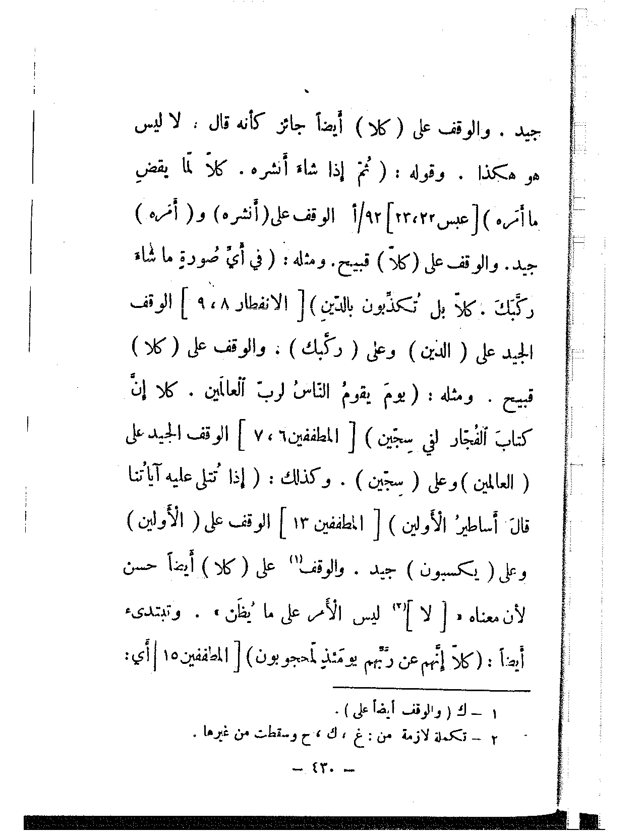 جيد. والوقف على (كلا) أيضًا جائز كأنه قال: لا ليس هو هكذا. وقوله: {ثم إذا شاء أنشره. كلا لما يقض ما أمره} [عبس: 22، 23] الوقف على (أنشره) و (أمره) جيد. والوقف على (كلاً) قبيح. ومثله: {في أي صورة ما شاء ركبك. كلا بل تكذبون بالدين} [الانفطار: 8، 9] الوقف الجيد على (الدين) وعلى (ركبك). والوقف على (كلا) قبيح. ومثله: {يوم يقوم الناس لرب العالمين. كلا إن كتاب الفجار لفي سجين} [المطففين 6، 7] الوقف الجيد على (العالمين) وعلى (سجين). وكذلك: {إذا تتلى عليه آياتنا قال أساطير الأولين} [المطففين: 13] الوقف على (الأولين) وعلى (يكسبون) جيد. والوقف على (كلا) أيضًا حسن لأن معناه «[لا] ليس الأمر على ما يظن». وتبتدئ أيضًا: {كلا إنهم عن ربهم يومئذ لمحجوبون} [المطففين: 15] أي: