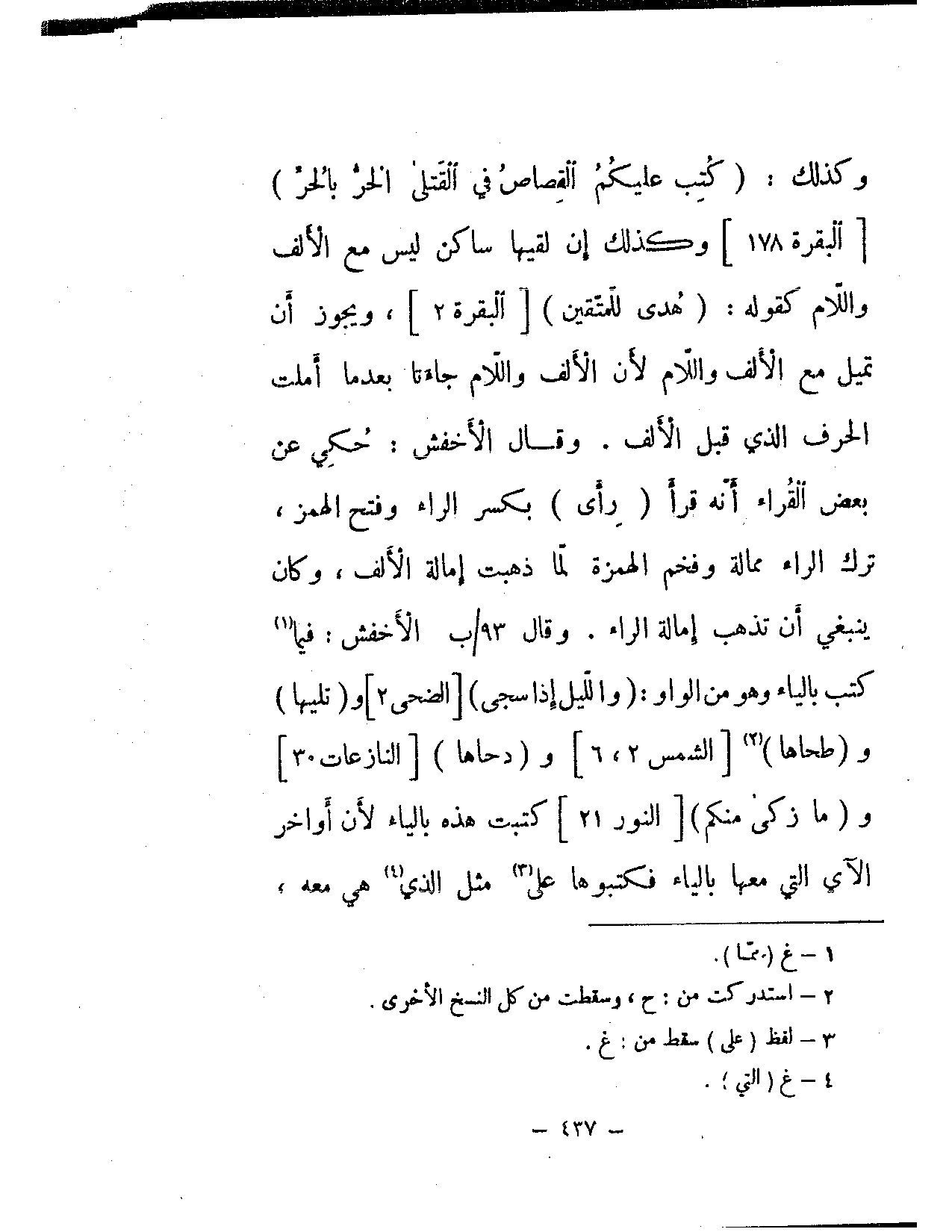 وكذلك: {كتب عليكم القصاص في القتلى الحر بالحر} [البقرة: 178] وكذلك إن لقيها ساكن ليس مع الألف واللام كقوله: {هدى للمتقين} [البقرة: 2]، ويجوز أن تميل مع الألف واللام لأن الألف واللام جاءتا بعدما أملت الحرف الذي قبل الألف. وقال الأخفش: حُكي عن بعض القراء أنه قرأ (رأى) بكسر الراء، وفتح الهمز، ترك الراء ممالة وفخم الهمزة لما ذهبت إمالة الألف، وكان ينبغي أن تذهب إمالة الراء. وقال الأخفش: فيما كتب بالياء وهو من الواو: {والليل إذا سجى} [الضحى: 2] و (تليها) و {طحاها} [الشمس: 2، 6] و {دحاها} [النازعات: 30] و {ما زكى منكم} [النور: 21] كتبت هذه بالياء لأن أواخر الآي التي معها بالياء فكتبوها على مثل الذي هي معه،