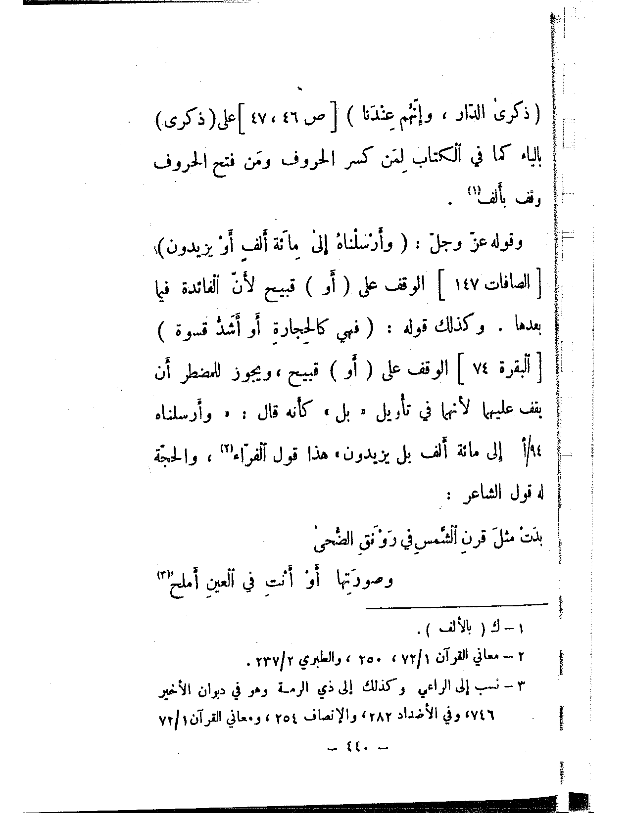 وقوله عز وجل: {وأرسلناه إلى مائة ألف أو يزيدون} [الصافات: 147] الوقف على (أو) قبيح لأن الفائدة فيما بعدها. وكذلك قوله: {فهي كالحجارة أو أشد قسوة} [البقرة: 74] الوقف على (أو) قبيح، ويجوز للمضطر أن يقف عليهما لأنهما في تأويل «بل» كأنه قال: «وأرسلناه إلى مائة ألف بل يزيدون» هذا قول الفراء، والحجة له قول الشاعر: