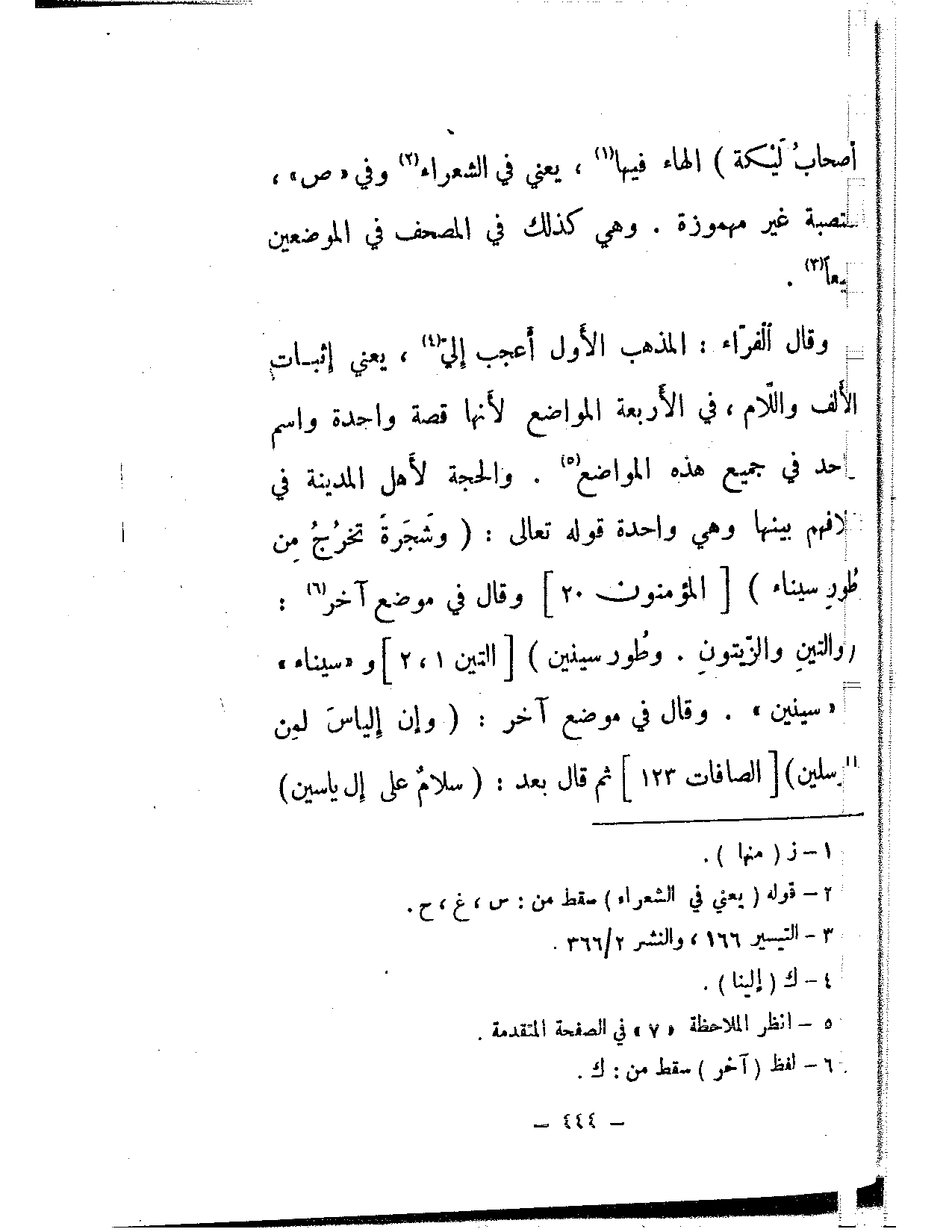 وقال الفراء: المذهب الأول أعجب إلي، يعني إثبات الألف واللام، في الأربعة المواضع لأنها قصة واحدة واسم واحد في جميع هذه المواضع. والحجة لأهل المدينة في خلالهم بينها وهي واحدة قوله تعالى: {وشجرة تخرج من طور سيناء} [المؤمنون: 20] وقال في موضع آخر: {والتين والزيتون. وطور سينين} [التين: 1، 2] و «سيناء» «سينين». وقال في موضع آخر: {وإن إلياس لمن المرسلين} [الصافات: 123] ثم قال بعد: {سلام على إل ياسين}