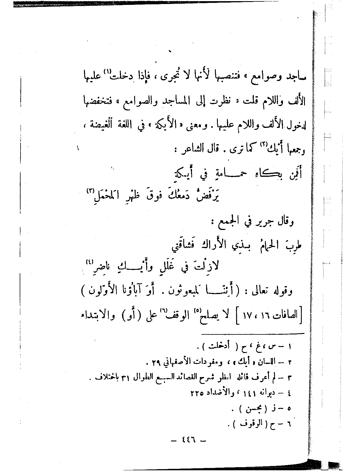 مساجد وصوامع» فتنصبها لأنها لا تجرى، فإذا دخلت عليها الألف واللام قلت «نظرت إلى المساجد والصوامع» فتخفضها لدخول الألف واللام عليها. ومعنى «الأيكة» في اللغة الغيضة، وجمعها أيك كما ترى. قال الشعر: