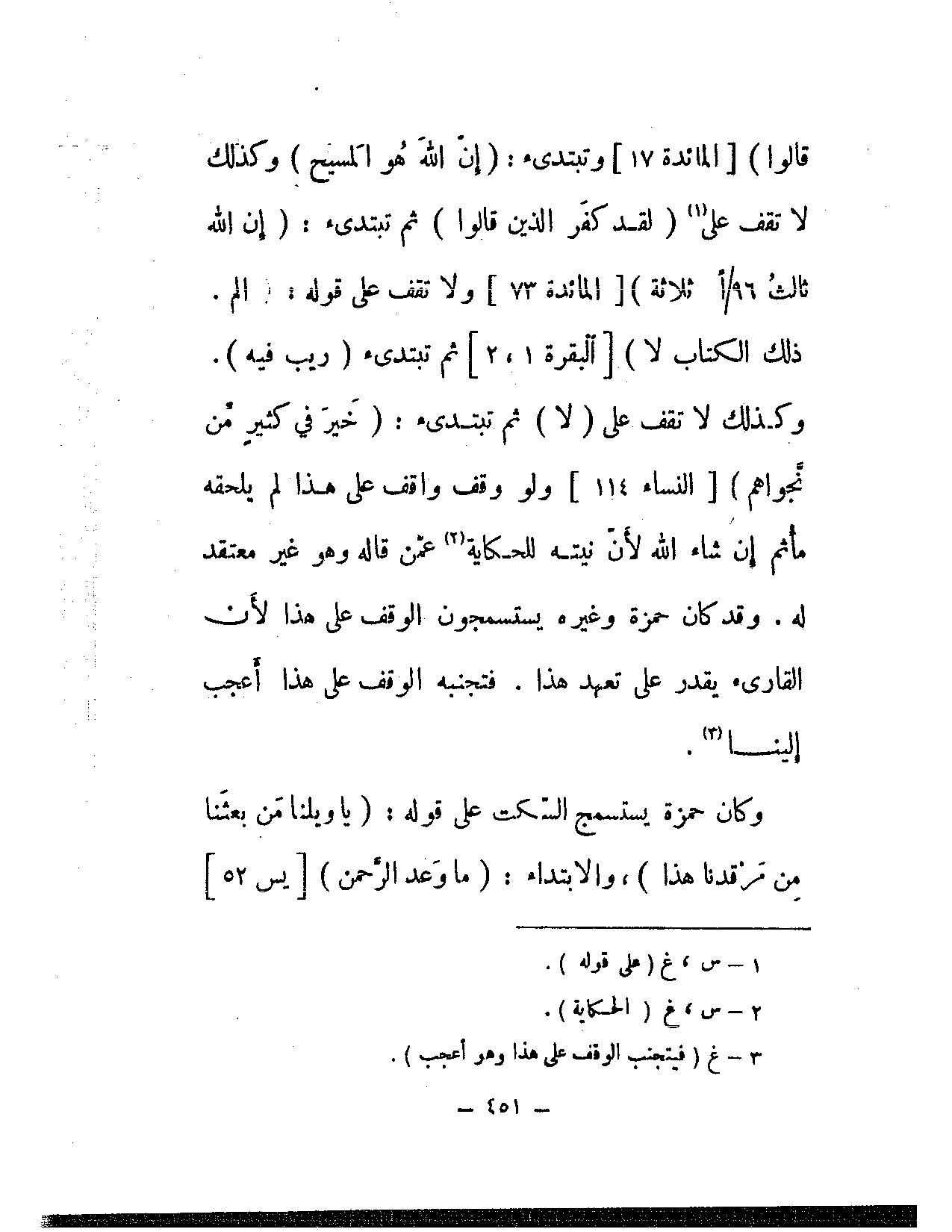 قالوا} [المائدة: 17] وتبتدئ: {إن الله هو المسيح} وكذلك لا تقف على (لقد كفر الذين قالوا) ثم تبتدئ: {إن الله ثالث ثلاثة} [المائدة: 73] ولا تقف على قوله: {الم. ذلك الكتاب لا} [البقرة: 1، 2] ثم تبتدئ {ريب فيه}. وكذلك لا تقف على (لا) ثم تبتبديء: {خير في كثير من نجواهم} [النساء: 14] ولو وقف واقف على هذا لم يلحقه مأثم إن شاء الله لأن نيته للحكاية عمن قاله وهو غير معتقد له. وقد كان حمزة وغيره يستسمجون الوقف على هذا لأن القارئ يقدر على تعهد هذا. فتجنبه الوقف على هذا أعجب إلينا.